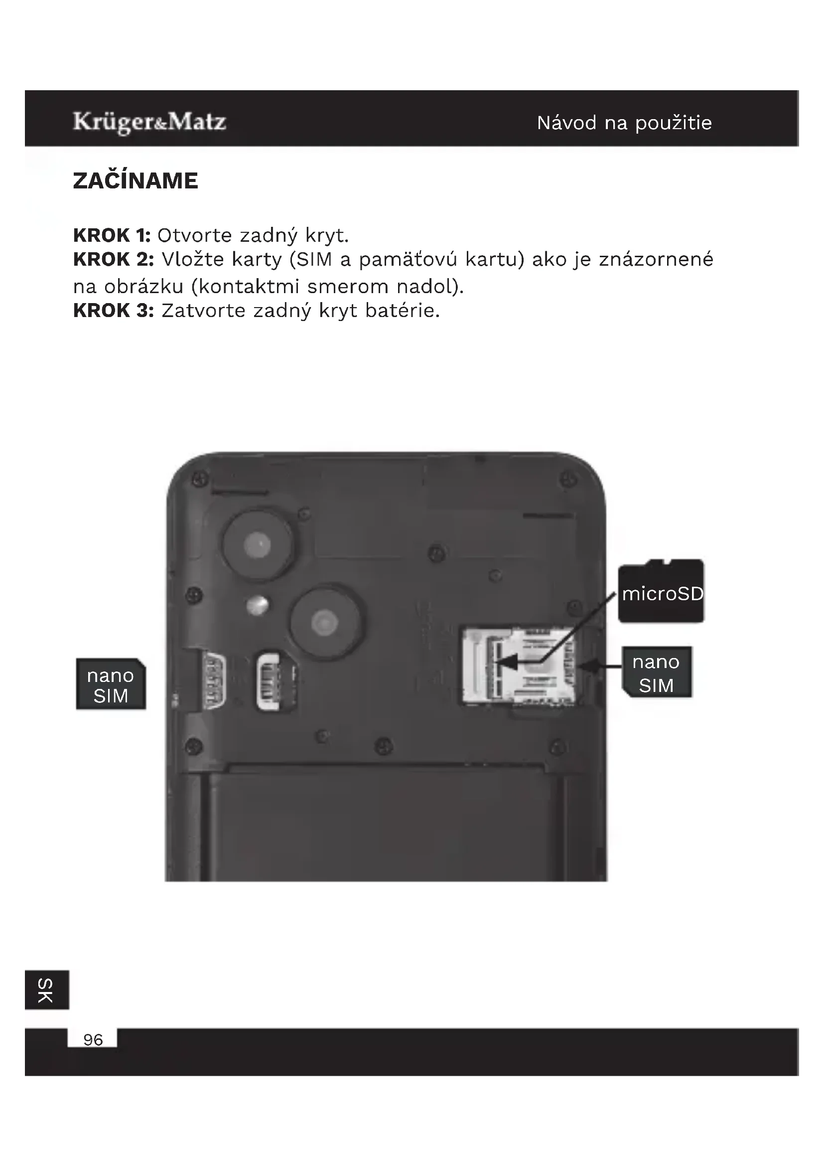 ZAČÍNAME KROK 1: Otvorte zadný kryt. KROK 2: Vložte karty (SIM apamäťovú kartu) ako je znázornené na obrázku (kontaktmi smerom nadol). KROK 3: Zatvorte zadný kryt batérie. microSD nano SIM nano SIMNávod na použitie