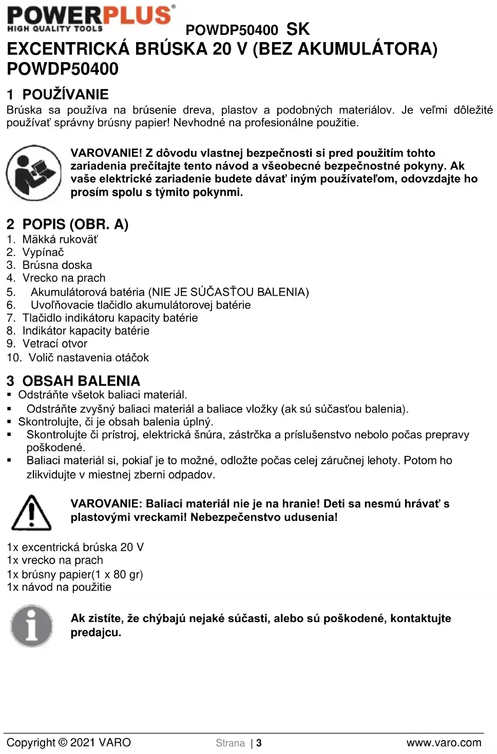 Copyright © 2021 VARO Strana | 3 www.varo.com EXCENTRICKÁ BRÚSKA 20 V (BEZ AKUMULÁTORA) POWDP50400 1 POUŽÍVANIE Brúska sa používa na brúsenie dreva, plastov a podobných materiálov. Je veľmi dôležité používať správny brúsny papier! Nevhodné na profesionálne použitie. VAROVANIE! Z dôvodu vlastnej bezpečnosti si pred použitím tohto zariadenia prečítajte tento návod a všeobecné bezpečnostné pokyny. Ak vaše elektrické zariadenie budete dávať iným používateľom, odovzdajte ho prosím spolu s týmito pokynmi. 2 POPIS (OBR. A)