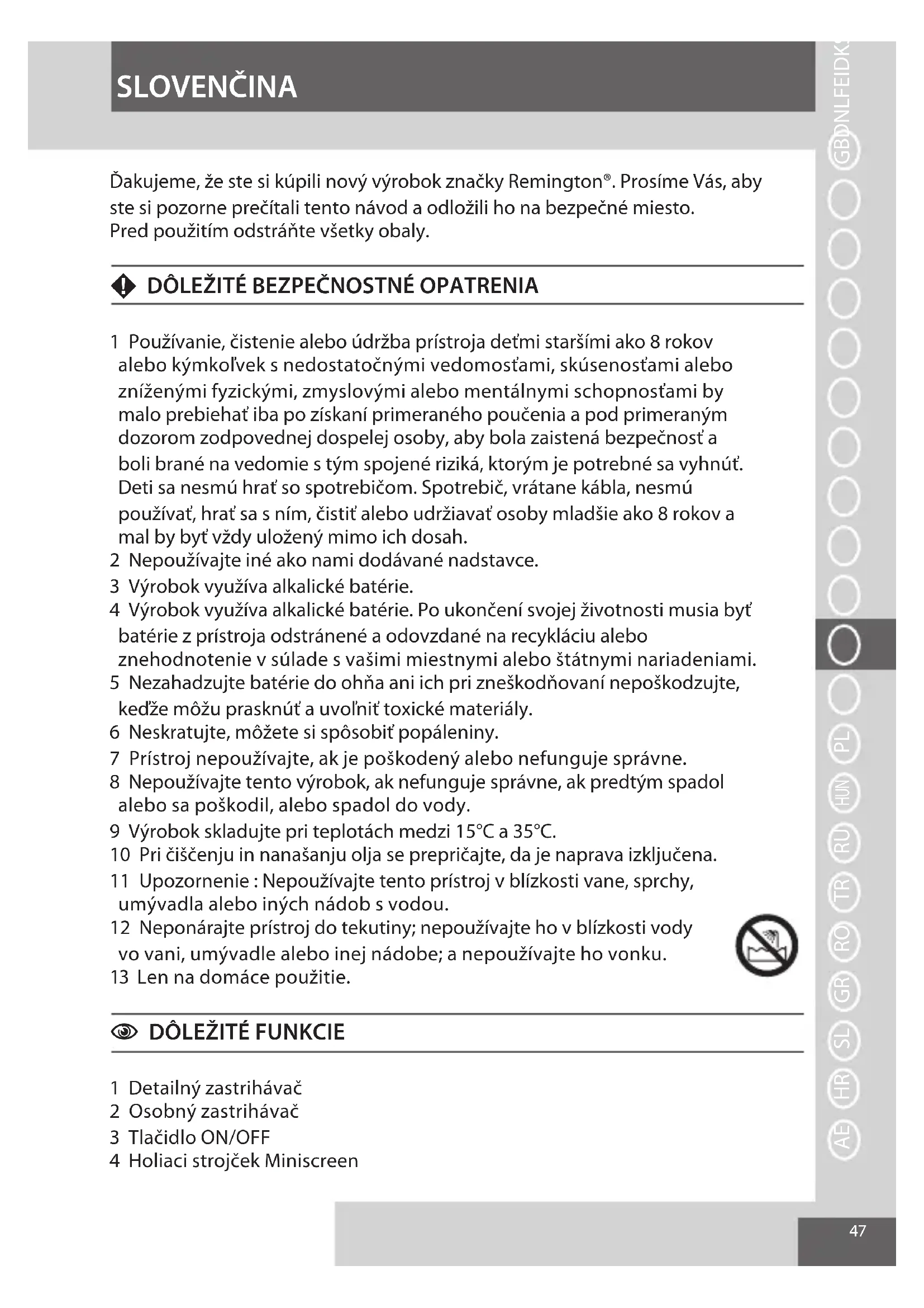 Para evitar riscos para a saúde e o ambiente devido a substâncias perigosas presentes em produtos elétricos e eletrónicos, os aparelhos marcados com este símbolo não devem ser deitados fora juntamente com o lixo doméstico, mas sim recuperados, reutilizados ou reciclados. PORTUGUÊS47 Ďakujeme, že ste si kúpili nový výrobok značky Remington®. Prosíme Vás, aby ste si pozorne prečítali tento návod a odložili ho na bezpečné miesto. Pred použitím odstráňte všetky obaly. F DÔLEŽITÉ BEZPEČNOSTNÉ OPATRENIA 1 Používanie, čistenie alebo údržba prístroja deťmi staršími ako 8 rokov alebo kýmkoľvek s nedostatočnými vedomosťami, skúsenosťami alebo zníženými fyzickými, zmyslovými alebo mentálnymi schopnosťami by malo prebiehať iba po získaní primeraného poučenia a pod primeraným dozorom zodpovednej dospelej osoby, aby bola zaistená bezpečnosť a boli brané na vedomie s tým spojené riziká, ktorým je potrebné sa vyhnúť. Deti sa nesmú hrať so spotrebičom. Spotrebič, vrátane kábla, nesmú používať, hrať sa s ním, čistiť alebo udržiavať osoby mladšie ako 8 rokov a mal by byť vždy uložený mimo ich dosah. 2 Nepoužívajte iné ako nami dodávané nadstavce. 3 Výrobok využíva alkalické batérie. 4 Výrobok využíva alkalické batérie. Po ukončení svojej životnosti musia byť batérie z prístroja odstránené a odovzdané na recykláciu alebo znehodnotenie v súlade s vašimi miestnymi alebo štátnymi nariadeniami. 5 Nezahadzujte batérie do ohňa ani ich pri zneškodňovaní nepoškodzujte, keďže môžu prasknúť a uvoľniť toxické materiály. 6 Neskratujte, môžete si spôsobiť popáleniny. 7 Prístroj nepoužívajte, ak je poškodený alebo nefunguje správne. 8 Nepoužívajte tento výrobok, ak nefunguje správne, ak predtým spadol alebo sa poškodil, alebo spadol do vody. 9 Výrobok skladujte pri teplotách medzi 15°C a 35°C. 10 Pri čiščenju in nanašanju olja se prepričajte, da je naprava izključena. 11 Upozornenie : Nepoužívajte tento prístroj v blízkosti vane, sprchy, umývadla alebo iných nádob s vodou. 12 Neponárajte prístroj do tekutiny; nepoužívajte ho v blízkosti vody vo vani, umývadle alebo inej nádobe; a nepoužívajte ho vonku. 13 Len na domáce použitie.