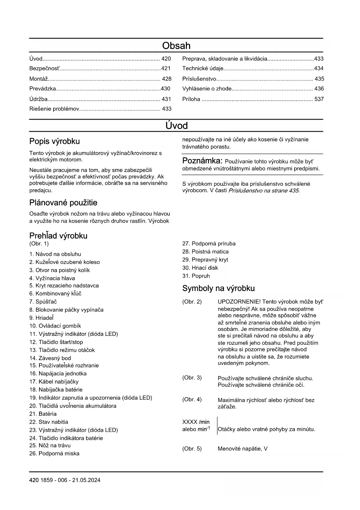 Otáčky alebo vratné pohyby za minútu. (Obr. 5) Menovité napätie, V 420 1859 - 006 - 21.05.2024(Obr. 6) Jednosmerný prúd. (Obr. 7) Tento výrobok je vsúlade spríslušnými smernicami ES. (Obr. 8) Tento výrobok je vsúlade spríslušnými právnymi predpismi Spojeného kráľovstva. (Obr. 9) Používajte schválené ochranné rukavice. (Obr. 10) Používajte odolné protišmykové topánky. (Obr. 11) Pozor na odrazenie noža. (Obr. 12) Symboly na výrobku alebo na jeho obale označujú, že sa tento výrobok nesmie likvidovať ako domáci odpad. Tento produkt sa musí odovzdať v príslušnom zariadení na recykláciu. (Obr. 13) Nadstavec môže odhodiť predmety, ktoré sa môžu odraziť späť. Ak sa nepoužíva odporúčané bezpečnostné vybavenie, môže to spôsobiť vážne poranenia očí. (Obr. 14) Pred vykonávaním údržby odpojte batériu. (Obr. 15) Výrobok je vybavený ochranou proti striekajúcej vode. (Obr. 16) Všetky časti tela udržiavajte mimo horúcich plôch. (Obr. 17) Označenie týkajúce sa emisie hluku do okolia podľa smerníc anariadení EÚ a Veľkej Británie alegislatívy štátu Nový Južný Wales „Protection of the Environment Operations (Noise Control) Regulation 2017“ (Nariadenie oochrane životného prostredia pri prevádzke (kontrola hluku) zroku 2017). Garantovaná hladina akustického výkonu produktu je uvedená v Technické údaje na strane 434
