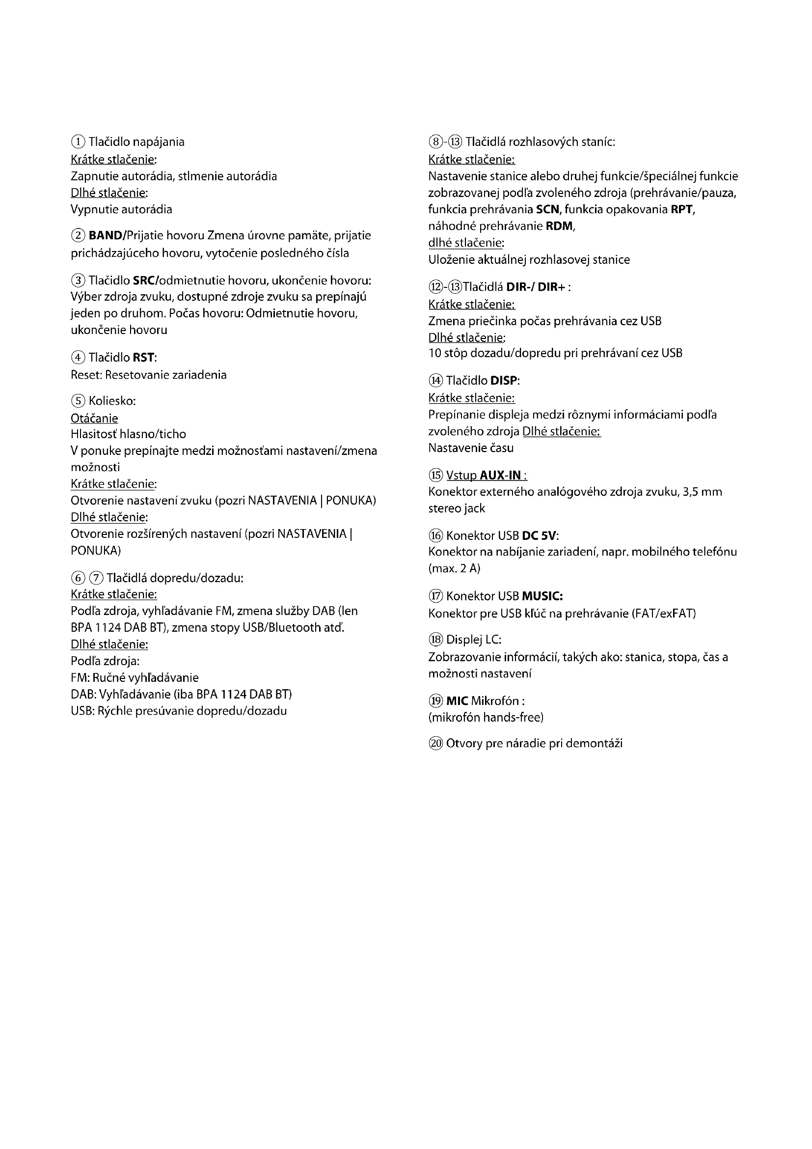 Krátke stlačenie: Zapnutie autorádia, stlmenie autorádia Dlhé stlačenie: Vypnutie autorádia ② BAND/Prijatie hovoru Zmena úrovne pamäte, prijatie prichádzajúceho hovoru, vytočenie posledného čísla ③ Tlačidlo SRC/odmietnutie hovoru, ukončenie hovoru: Výber zdroja zvuku, dostupné zdroje zvuku sa prepínajú jeden po druhom. Počas hovoru: Odmietnutie hovoru, ukončenie hovoru ④ Tlačidlo RST: Reset: Resetovanie zariadenia ⑤ Koliesko: Otáčanie Hlasitosť hlasno/ticho V ponuke prepínajte medzi možnosťami nastavení/zmena možnosti Krátke stlačenie: Otvorenie nastavení zvuku (pozri NASTAVENIA | PONUKA) Dlhé stlačenie: Otvorenie rozšírených nastavení (pozri NASTAVENIA | PONUKA) ⑥ ⑦ Tlačidlá dopredu/dozadu: Krátke stlačenie: Podľa zdroja, vyhľadávanie FM, zmena služby DAB (len BPA 1124 DAB BT), zmena stopy USB/Bluetooth atď. Dlhé stlačenie: Podľa zdroja: FM: Ručné vyhľadávanie DAB: Vyhľadávanie (iba BPA 1124 DAB BT) USB: Rýchle presúvanie dopredu/dozadu ⑧-⑬ Tlačidlá rozhlasových staníc: Krátke stlačenie: Nastavenie stanice alebo druhej funkcie/špeciálnej funkcie zobrazovanej podľa zvoleného zdroja (prehrávanie/pauza, funkcia prehrávania SCN, funkcia opakovania RPT, náhodné prehrávanie RDM, dlhé stlačenie: Uloženie aktuálnej rozhlasovej stanice ⑫-⑬Tlačidlá DIR-/ DIR+ : Krátke stlačenie: Zmena priečinka počas prehrávania cez USB Dlhé stlačenie: 10 stôp dozadu/dopredu pri prehrávaní cez USB ⑭ Tlačidlo DISP: Krátke stlačenie: Prepínanie displeja medzi rôznymi informáciami podľa zvoleného zdroja Dlhé stlačenie: Nastavenie času ⑮ Vstup AUX-IN : Konektor externého analógového zdroja zvuku, 3,5 mm stereo jack ⑯ Konektor USB DC 5V: Konektor na nabíjanie zariadení, napr. mobilného telefónu (max. 2 A) ⑰ Konektor USB MUSIC: Konektor pre USB kľúč na prehrávanie (FAT/exFAT) ⑱ Displej LC: Zobrazovanie informácií, takých ako: stanica, stopa, čas a možnosti nastavení ⑲ MIC Mikrofón : (mikrofón hands-free) ⑳ Otvory pre náradie pri demontážiSK
