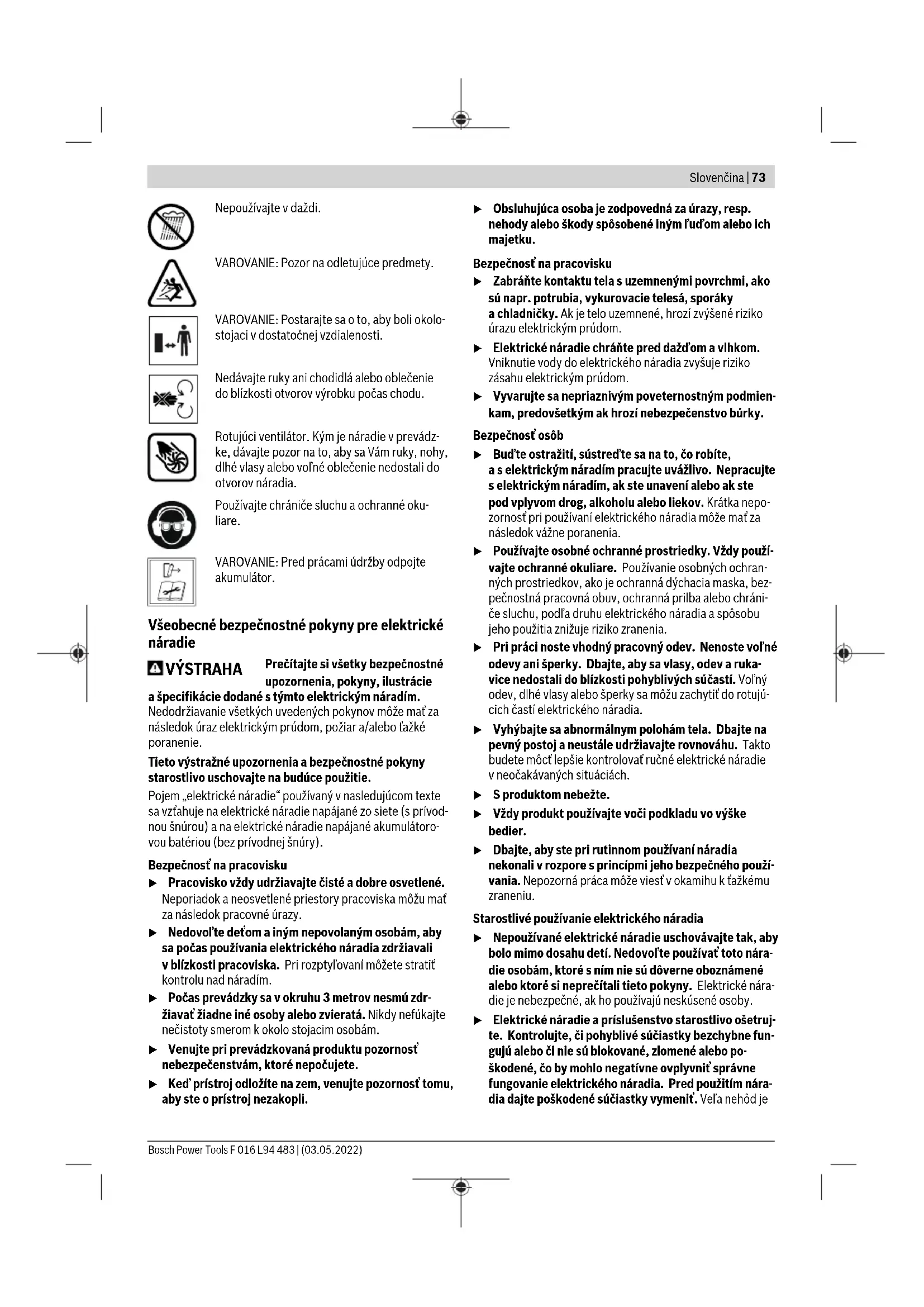 Symboly Následující symboly mají význam pro čtení a pochopení návodu k obsluze. Zapamatujte si symboly a jejich význam. Správná interpretace symbolů Vám pomůže výrobek lépe a bezpečněji používat. Symbol Význam Směr pohybu Zapnutí Vypnutí CLICK! Slyšitelný zvuk Příslušenství Hledání závad Následující tabulka ukazuje příznaky závad a jak můžete učinit nápravu, pokud Váš stroj někdy nepracuje dobře. Pokud s ní nemůžete problém lokalizovat a odstranit, obraťte se na Váš servis. Pozor: Před hledáním chyb stroj vypněte. Pozor: V případě úrazu nebo porušení nástroje stroj ihned zastavte a odstraňte akumulátor. Příznak Možná příčina Odstranění Zahradní nářadí neběží Vybitý akumulátor Nabijte akumulátor Akumulátor není správně nasazený Akumulátor správně nasaďte (viz obrázek C) Příliš studený/horký akumulátor Akumulátor nechte ohřát/ochladit Výrobek startujte vždy s nižším počtem otáček Vadné zahradní nářadí Vyhledejte servis Zahradní nářadí běží přerušovaně Vadný spínač Vyhledejte servis Vadný regulátor rychlosti vzduchového proudu Vyhledejte servis Silné vibrace/hluk Vadné zahradní nářadí Vyhledejte servis Bosch Power Tools F 016 L94 483 | (03.05.2022)72 | Slovenčina Příznak Možná příčina Odstranění Příliš krátká doba práce na jedno nabití akumulátoru Akumulátor nebyl delší dobu používán nebo pouze krátkodobě Akumulátor zcela nabijte Akumulátor je vadný Akumulátor nahraďte Zahradní nářadí fouká Zablokovaná hubice Hubici uvolněte Omezený proud vzduchu Zablokovaný přívod vzduchu Přívod vzduchu uvolněte Příliš studený akumulátor Výrobek startujte vždy s nižším počtem otáček Hubici nelze namontovat Nesprávná montáž Hubici namontujte správně (viz obrázek B) Údržba a servis Údržba, čištění a skladování u Nechte výrobky opravit pouze kvalifikovanými odbornými pracovníky apouze za použití originálních náhradních dílů. Tím bude zajištěno, že zůstane zachovaná bezpečnost. u Nikdy neprovádějte servis poškozených akumulátorů. Servis akumulátorů by měl provádět pouze výrobce nebo autorizovaná opravna. Zákaznická služba aporadenství ohledně použití Zákaznická služba zodpoví vaše dotazy kopravě aúdržbě vašeho výrobku atéž knáhradním dílům. Rozkladové výkresy ainformace onáhradních dílech najdete také na: www.bosch-pt.com Vpřípadě dotazů knašim výrobkům apříslušenství vám ochotně pomůže poradenský tým Bosch. Vpřípadě veškerých otázek aobjednávek náhradních dílů bezpodmínečně uveďte 10místné věcné číslo podle typového štítku výrobku. Czech Republic Robert Bosch odbytová s.r.o. Bosch Service Center PT K Vápence 1621/16 692 01 Mikulov Na www.bosch-pt.cz si si můžete objednat opravu Vašeho stroje nebo náhradní díly online. Tel.: +420 519 305700 Fax: +420 519 305705 E-Mail: servis.naradi@cz.bosch.com www.bosch-pt.cz Další adresy servisů najdete na: www.bosch-pt.com/serviceaddresses Přeprava Doporučené lithium-iontové akumulátory podléhají požadavkům zákona onebezpečných nákladech. Tyto akumulátory mohou být bez dalších podmínek přepravovány uživatelem po silnici. Při zasílání prostřednictvím třetí osoby (např.: letecká přeprava nebo spedice) je třeba brát zřetel na zvláštní požadavky na balení aoznačení. Zde musí být při přípravě zásilky nezbytně přizván expert na nebezpečné náklady. Akumulátory zasílejte pouze tehdy, pokud není poškozený kryt. Otevřené kontakty přelepte lepicí páskou aakumulátor zabalte tak, aby se vobalu nemohl pohybovat. Dodržujte také případné další národní předpisy. Likvidace Výrobky, akumulátory, příslušenství a obaly mají být dodány k opětovnému zhodnocení nepoškozujícímu životní prostředí. Výrobky aakumulátory/baterie nevyhazujte do domovního odpadu! Pouze pro zeměEU: Podle evropské směrnice 2012/19/EU musejí být neupotřebitelné výrobky a podle evropské směrnice 2006/66/ES vadné nebo opotřebované akumulátory/ baterie odděleně shromážděny a dodány k opětovnému zhodnocení nepoškozujícímu životní prostředí. Při nesprávné likvidaci mohou odpadní elektrická aelektronická zařízení kvůli případnému obsahu nebezpečných látek poškodit životní prostředí alidské zdraví. Akumulátory/baterie: Lithium-iontové: Dodržujte pokyny uvedené včásti Přeprava (viz „Přeprava“, Stránka72). Slovenčina Bezpečnostné pokyny Vysvetlenie symbolov na záhradnom náradí Všeobecné upozornenie na nebezpečenstvo. Prečítajte si Návod na používanie. F 016 L94 483 | (03.05.2022) Bosch Power ToolsSlovenčina | 73 Nepoužívajte vdaždi. VAROVANIE: Pozor na odletujúce predmety. VAROVANIE: Postarajte sa o to, aby boli okolo- stojaci v dostatočnej vzdialenosti. Nedávajte ruky ani chodidlá alebo oblečenie do blízkosti otvorov výrobku počas chodu. Rotujúci ventilátor. Kým je náradie v prevádz- ke, dávajte pozor na to, aby sa Vám ruky, nohy, dlhé vlasy alebo voľné oblečenie nedostali do otvorov náradia. Používajte chrániče sluchu a ochranné oku- liare. VAROVANIE: Pred prácami údržby odpojte akumulátor. Všeobecné bezpečnostné pokyny pre elektrické náradie VÝSTRAHA Prečítajte si všetky bezpečnostné upozornenia, pokyny, ilustrácie ašpecifikácie dodané stýmto elektrickým náradím. Nedodržiavanie všetkých uvedených pokynov môže mať za následok úraz elektrickým prúdom, požiar a/alebo ťažké poranenie. Tieto výstražné upozornenia abezpečnostné pokyny starostlivo uschovajte na budúce použitie. Pojem „elektrické náradie“ používaný vnasledujúcom texte sa vzťahuje na elektrické náradie napájané zo siete (sprívod- nou šnúrou) ana elektrické náradie napájané ak