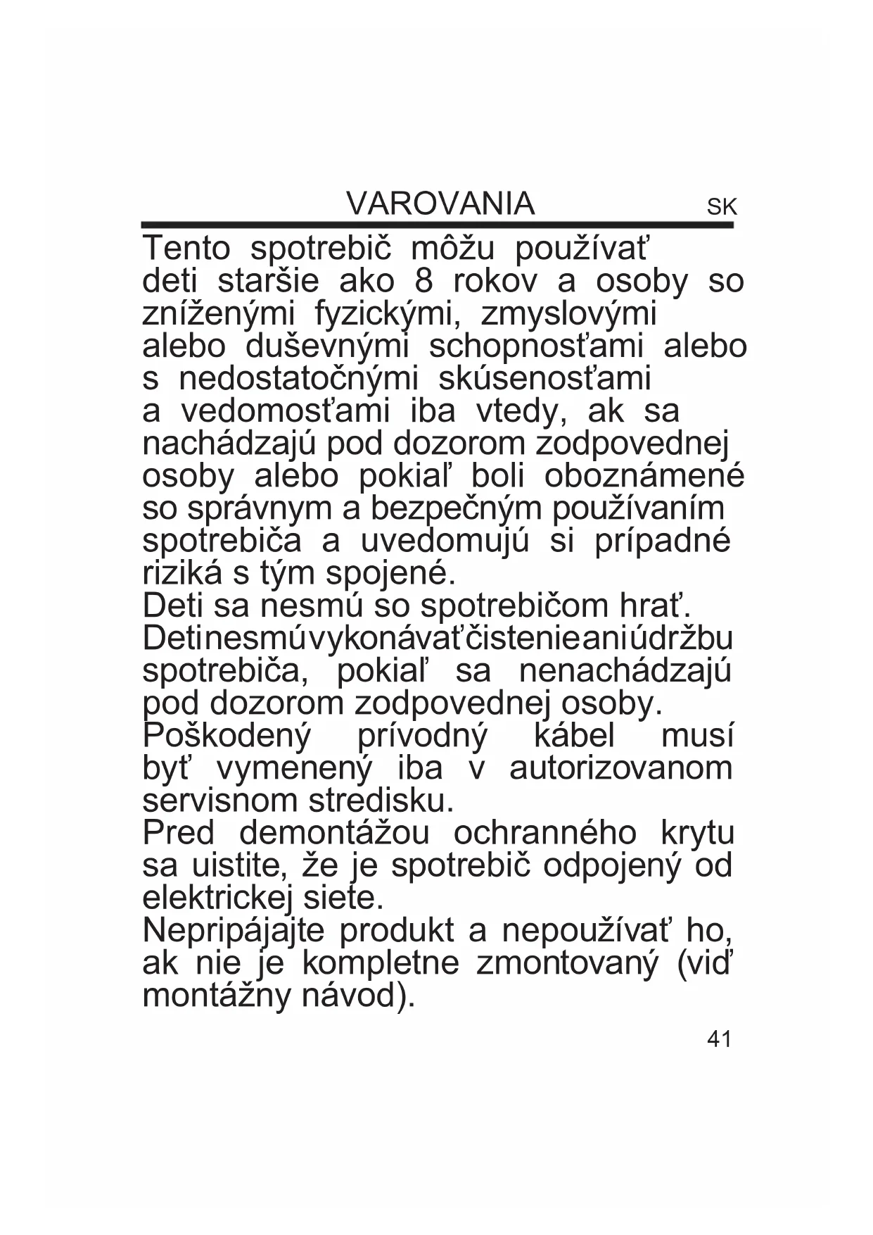 Záruka na tento spotrebič predstavuje 24 mesiacov od dátumu zakúpenia. Nárok na záruku je možné uplatniť len po predložení originálu dokladu o zakúpení výrobku (paragón, faktúra) s typovým označením výrobku, dátumom predaja a čitateľnou pečiatkou predajcu. Záruka zahŕňa výmenu alebo opravu častí spotrebiča, ktoré sa poškodia z dôvodu porúch vo výrobe spotrebiča. Po uplynutí záručnej doby bude spotrebič opravený za poplatok. Výrobca nezodpovedá za poškodenia alebo úrazy osôb, zvierat z dôvodu nesprávneho použitia spotrebiča a nedodržania pokynov v návode na obsluhu. Výrobok je určený výhradne ako domáci spotrebič pre použitie v domácnosti. Zmluvná záruka je 6 mesiacov, ak je kupujúci podnikateľ - fyzická osoba a spotrebič kupuje pre podnikateľskú činnosť alebo komerčné využitie. Záruka sa znižuje podľa občianskeho zákonníka na 6 mesiacov pre: žiarovky, batérie, kremíkové a halogénové trubice. Záruka sa nevzťahuje na - akékoľvek mechanické poškodenie výrobku alebo jeho časti - na chyby spôsobené nevhodným zaobchádzaním alebo umiestnením. - ak je zariadenie obsluhované v rozpore s návodom, prípadne zásahom neoprávnenej osoby. - nesprávne používaný, skladovaný alebo prenášaný. - na záruku 24 mesiacov sa nevzťahujú opravy, napríklad: výmena žiarovky, trubice, čistenie a odvápňovanie kávovarov, žehličiek, zvlhčovačov, atď. Tu bude účtované servisom za zmluvnú cenu. - ak nebude pri kontrole zariadenia zistená žiadna porucha alebo nebudú splnené záručné podmienky, uhradí režijné náklady spojené s kontrolou alebo opravou výrobku kupujúci. - zákazník stráca záruku pri používaní výrobkov na profesionálnej alebo inej zárobkovej činnosti v prevádzkach. - porucha bola spôsobená vonkajšími a živelnými podmienkami (napr. poruchami v elektrickej sieti alebo bytovej inštalácii). - záruka sa netýka poškodenia vonkajšieho vzhľadu alebo iných, ktoré nebránia štandardnej obsluhe. Ak tovar pri uplatňovaní poruchy zo strany spotrebiteľa bude zasielaný poštou alebo prepravnou službou, musí byť zabalený v obale vhodnom pre prepravu tak, aby sa zabránilo poškodeniu výrobku.48 Priezvisko/meno: ............................................................................................................................................................................... Dátum/miesto predaja: ................................................................................................................................................................... Popis poruchy: ....................................................................................................................................................................................
