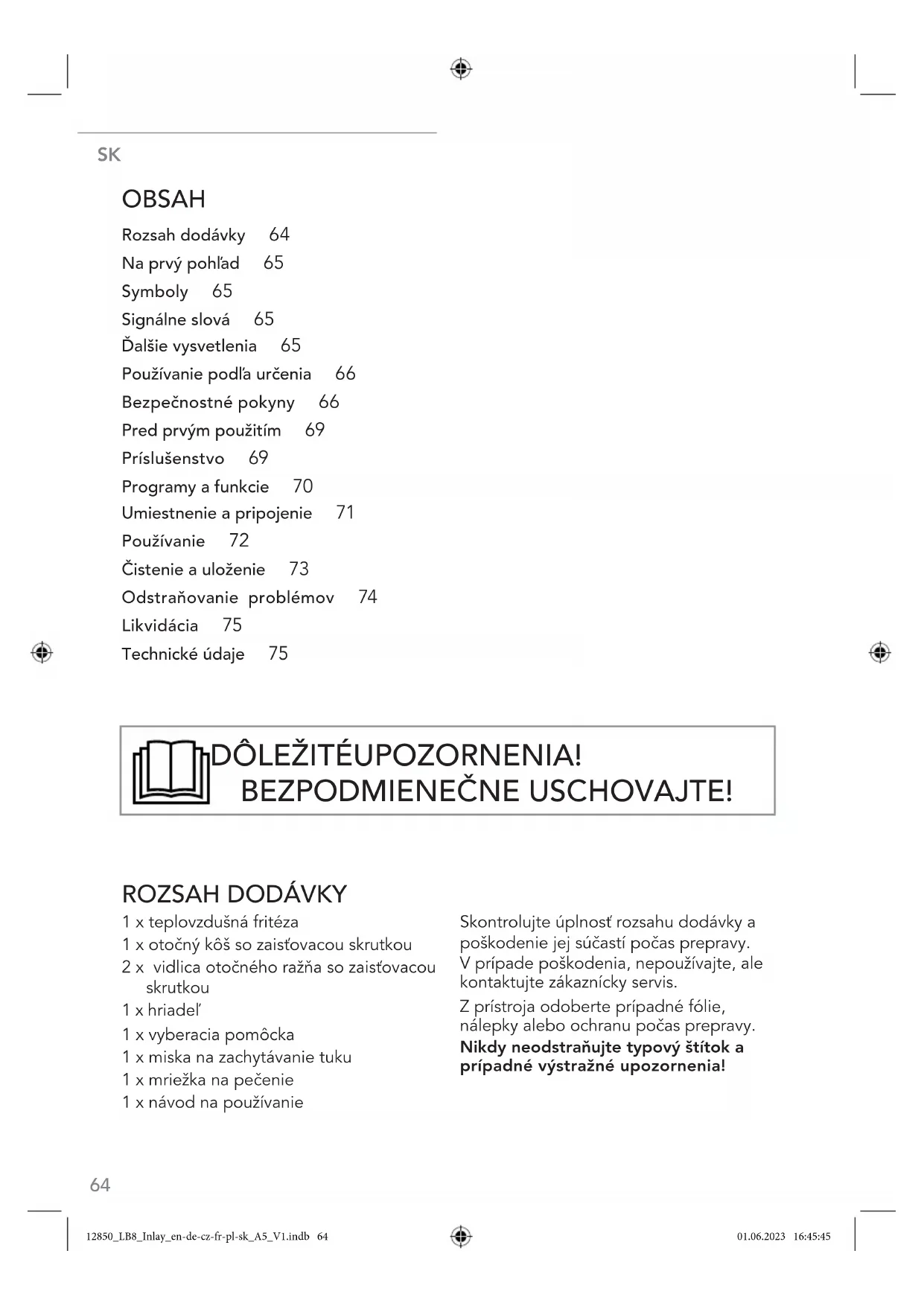 1 x teplovzdušná fritéza 1 x otočný kôš so zaisťovacou skrutkou 2 x vidlica otočného ražňa so zaisťovacou skrutkou 1 x hriadeľ 1 x vyberacia pomôcka 1 x miska na zachytávanie tuku 1 x mriežka na pečenie 1 x návod na používanie Skontrolujte úplnosť rozsahu dodávky a poškodenie jej súčastí počas prepravy. V prípade poškodenia, nepoužívajte, ale kontaktujte zákaznícky servis. Z prístroja odoberte prípadné fólie, nálepky alebo ochranu počas prepravy. Nikdy neodstraňujte typový štítok a prípadné výstražné upozornenia! DÔLEŽITÉ UPOZORNENIA! BEZPODMIENEČNE USCHOVAJTE! 12850_LB8_Inlay_en-de-cz-fr-pl-sk_A5_V1.indb 6412850_LB8_Inlay_en-de-cz-fr-pl-sk_A5_V1.indb 64 01.06.2023 16:45:4501.06.2023 16:45:45Digitálna teplovzdušná fritéza XL