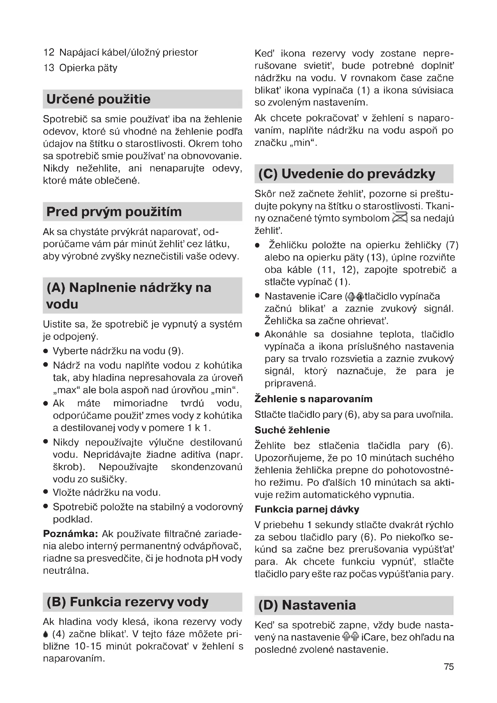 Spotrebič položte na stabilný a vodorovný podklad. Poznámka: Ak používate filtračné zariade- nia alebo interný permanentný odvápňovač, riadne sa presvedčite, či je hodnota pH vody neutrálna. (B) Funkcia rezervy vody Ak hladina vody klesá, ikona rezervy vody (4) začne blikať. V tejto fáze môžete pri- bližne 10-15 minút pokračovať v žehlení s naparovaním. Keď ikona rezervy vody zostane nepre- rušovane svietiť, bude potrebné doplniť nádržku na vodu. V rovnakom čase začne blikať ikona vypínača (1) a ikona súvisiaca so zvoleným nastavením. Ak chcete pokračovať v žehlení s naparo- vaním, naplňte nádržku na vodu aspoň po značku „min“. (C) Uvedenie do prevádzky Skôr než začnete žehliť, pozorne si preštu- dujte pokyny na štítku o starostlivosti. Tkani- ny označené týmto symbolom sa nedajú žehliť.