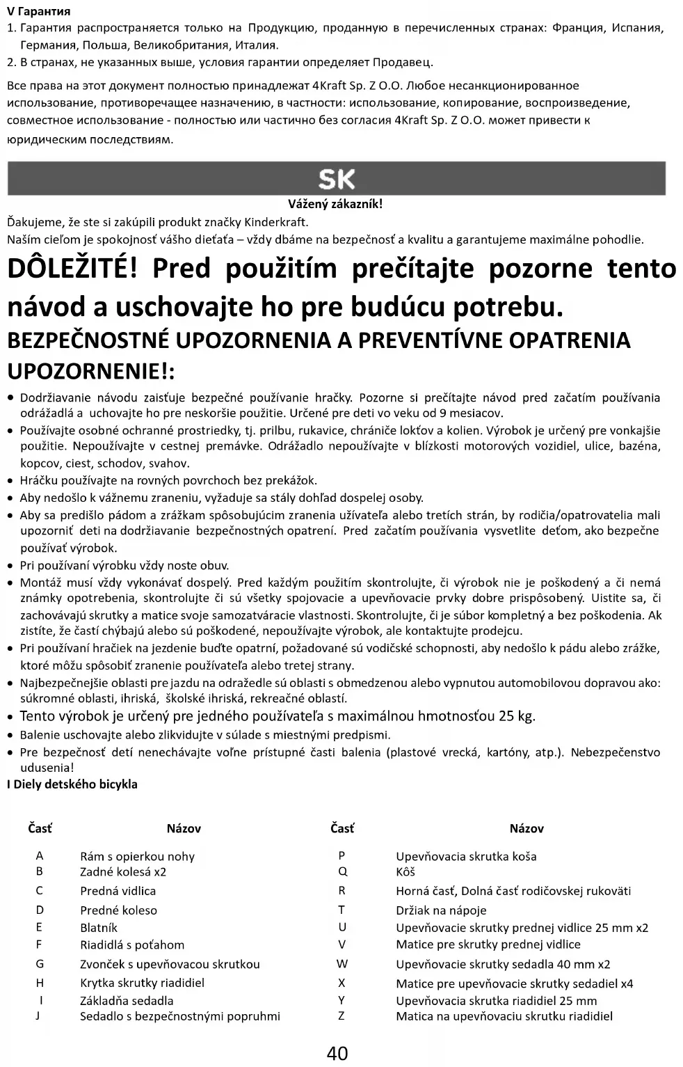 prvkami by nemala byť žiadna vôľa, pretože to ovplyvní ovládanie riadenia. Pomocou skrutky (P) pripevnite kôš (Q) na rám (obr. 6). Spojte základňu sedadla (I) a operadlo (K) pomocou skrutky (A‘) a zaistite maticou (B') (obr. 7). Základňu sedačky (I) môžete upevniť v jednom z dvoch otvorov na operadle (K), bližšie k zadnému operadlu a ďalej od bočných krytov (L) alebo bližšie od zadného operadla a ďalej k bočným krytom (L). Získaný prvok a sedadlo (J) pripevnite k rámu pomocou skrutiek - skrutky sedadla (V) vložte do otvoru v základni a ráme a potom ich zaistite maticami (W) (obr. 8). Pripevnite bočné kryty (L) k operadlu tak, že ich prispôsobíte k rúram na zadnej strane sedadla (obr. 9). Látkový poťah (M+N) nasuňte na sedadlo a operadlo (obr. 10). Pri nasúvaní materiálu na sedadlo najskôr preložte bezpečnostné popruhy cez otvory na bočných stranách, potom nasuňte hornú časť poťahu a natiahnite jeho spodnú časť. Uistite sa, aby popruhy neboli skrútené. Bezpečnostné popruhy sú továrensky pripevnené - v neskoršej fáze vývoja dieťaťa, keď už nie sú potrebné, ich odskrutkujte zo sedadla. Zasuňte striešku (O) do otvorov v zadnej časti operadla a zaistite pákami (obr. 11). Obidve časti rodičovskej rukoväte (R) vložte do otvoru v zadnej časti rámu, až kým nebudete počuť zvuk zaistenia (obr. 12). Držiak na poháre (T) nasuňte na rodičovskú rukoväť. Pri montáži zvončeka (G) najskôr uvoľnite skrutku a umiestnite korpus zvončeka na riadidlá, potom skrutku utiahnite (obr. 12). Hotový bicykel je znázornený na obr. 13. Malé časti uchovávajte mimo dosahu detí. III Nastavenie bicykla: Poloha striešky – dĺžka striešky je nastaviteľná. Odopnutím bezpečnostnej pracky je možné predĺžiť striešku.. Opierka na nohy – v závislosti od úrovne vývoja dieťaťa je možné opierku na nohy rozložiť alebo zložiť tak, aby mohlo dieťa samo bicyklovať. Vždy, keď je opierka na nohy rozložená, zablokujte pedále v prednom kolese (červená páka) (obr. 14). UPOZORNENIE! Vždy, keď je namontovaná rukoväť rodiča a je rozložená opierka nôh, musí byť poistka kolies uvoľnená tak, aby sa pedále voľne otáčali bez uvedenia kolesa do pohybu (pohon je vypnutý). Bez odblokovania tejto poistky môže dôjsť k zmliaždeniu alebo poraneniu nohy! Po odstránení rodičovskej rukoväte zložte opierku na nohy a nastavte poistku kolesa tak, aby pedále uviedli koleso do pohybu (pohon je zapnutý). Pre jeho rozloženie/zloženie potiahnite páku a potom nastavte opierky nôh do pohodlnej polohy (obr. 15). Bezpečnostné pásy – nastavte ich dĺžku tak, aby dieťa pevne držali, a aby neblokovali jeho pohyby. Poloha sedadla – sedadlo je možné nastaviť dopredu a dozadu a otočiť zadnou stranou voči smeru jazdy. Za týmto účelom odblokujte sedadlo červeným tlačidlom umiestneným pod spodom a potom ho otočte, až kým nebudete počuť zvuk zaistenia (obr. 16). Kolo možno upraviť pre staršie deti odstránením strechy, bočných krytov a rodičovského držadlá a sklopením opierky nôh Nastavenie dĺžky rodičovskej rukoväte - stlačte tlačidlo, presuňte nadol a zaistite v nižšej polohe, ak bola predchádzajúca poloha príliš vysoká. IV Údržba a čistenie Neprať. Produkt môžete umývať jemne navlhčenou handričkou a šetrným čistiacim prostriedkom. Nesušiť v bubnovej sušičke Prať max. pri teplote 30°C, šetrné pranie Nežehliť Nebieliť