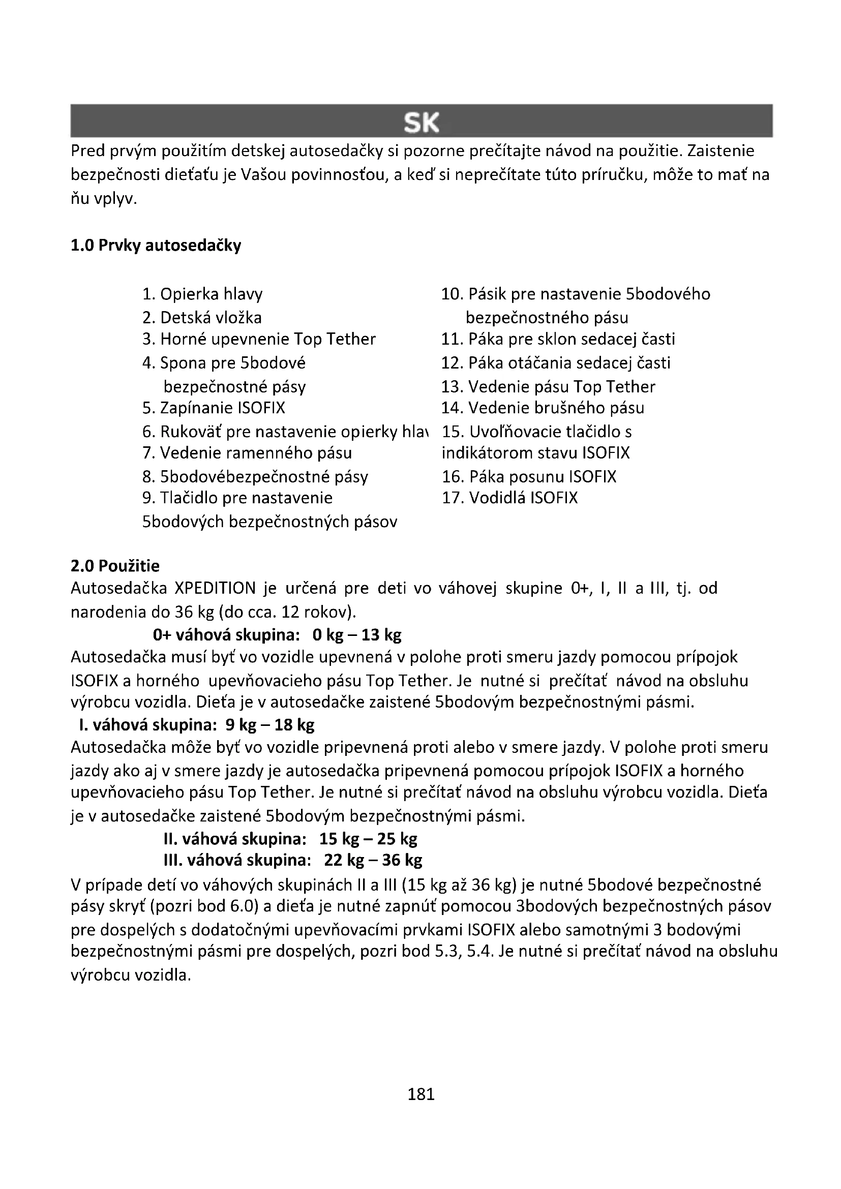 Autosedačka XPEDITION je určená pre deti vo váhovej skupine 0+, I, II a III, tj. od narodenia do 36 kg (do cca. 12 rokov). 0+ váhová skupina: 0 kg – 13 kg Autosedačka musí byť vo vozidle upevnená v polohe proti smeru jazdy pomocou prípojok ISOFIX a horného upevňovacieho pásu Top Tether. Je nutné si prečítať návod na obsluhu výrobcu vozidla. Dieťa je v autosedačke zaistené 5bodovým bezpečnostnými pásmi.