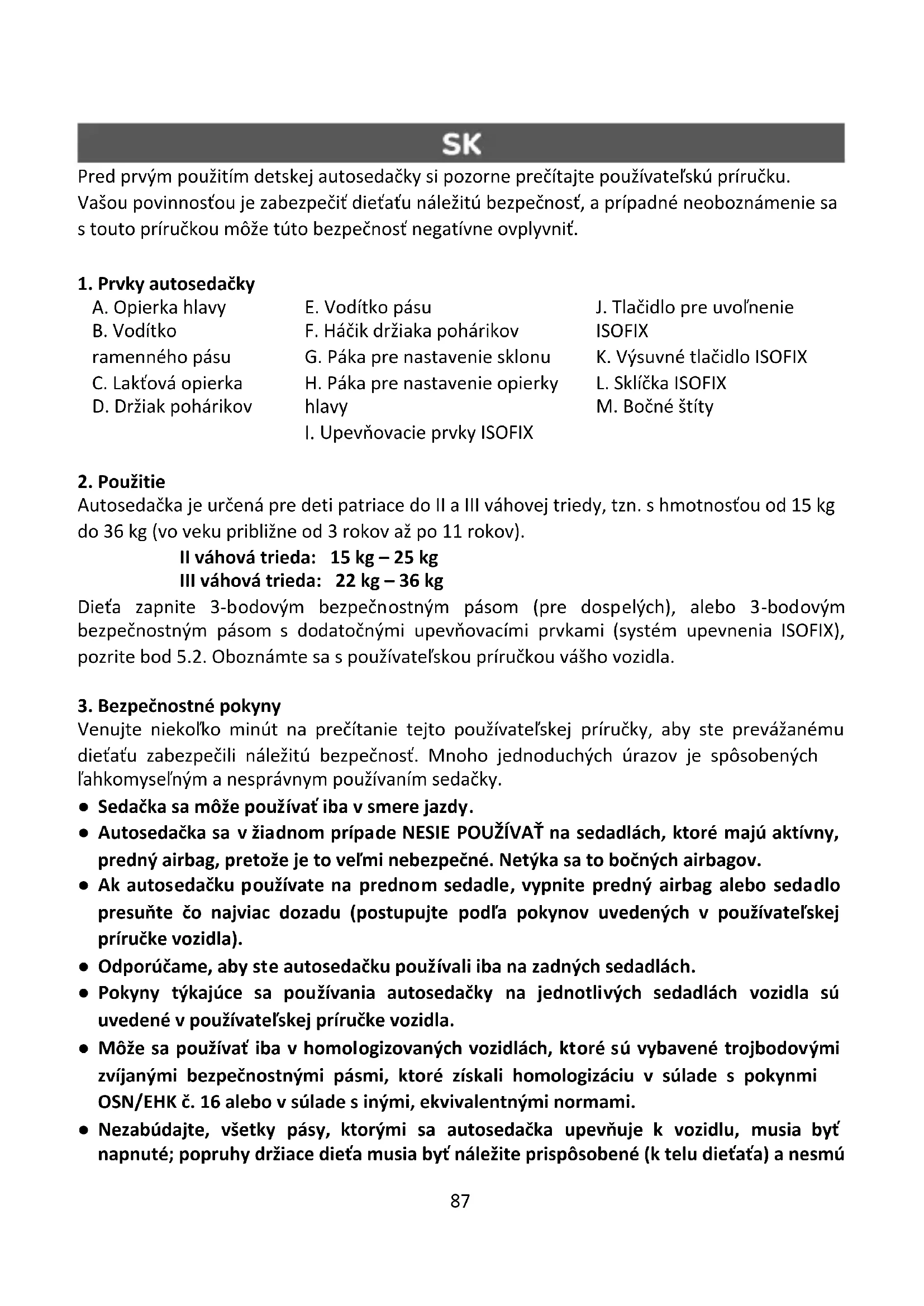Venujte niekoľko minút na prečítanie tejto používateľskej príručky, aby ste prevážanému dieťaťu zabezpečili náležitú bezpečnosť. Mnoho jednoduchých úrazov je spôsobených ľahkomyseľným a nesprávnym používaním sedačky. ● Sedačka sa môže používať iba v smere jazdy. ● Autosedačka sa v žiadnom prípade NESIE POUŽÍVAŤ na sedadlách, ktoré majú aktívny, predný airbag, pretože je to veľmi nebezpečné. Netýka sa to bočných airbagov. ● Ak autosedačku používate na prednom sedadle, vypnite predný airbag alebo sedadlo presuňte čo najviac dozadu (postupujte podľa pokynov uvedených v používateľskej príručke vozidla). ● Odporúčame, aby ste autosedačku používali iba na zadných sedadlách. ● Pokyny týkajúce sa používania autosedačky na jednotlivých sedadlách vozidla sú uvedené v používateľskej príručke vozidla. ● Môže sa používať iba v homologizovaných vozidlách, ktoré sú vybavené trojbodovými zvíjanými bezpečnostnými pásmi, ktoré získali homologizáciu v súlade s pokynmi OSN/EHK č. 16 alebo v súlade s inými, ekvivalentnými normami. ● Nezabúdajte, všetky pásy, ktorými sa autosedačka upevňuje k vozidlu, musia byť napnuté; popruhy držiace dieťa musia byť náležite prispôsobené (k telu dieťaťa) a nesmú88 byť skrútené. ● V prípade, ak bola autosedačka vystavená náhlym a silným záťažiam pôsobiacim počas autonehody, musí sa vymeniť. ● Autosedačka sa nesmie žiadnym spôsobom upravovať. ● Autosedačku chráňte pred pôsobením priameho slnečného žiarenia, v opačnom prípade sa niektoré prvky môžu zohriať a popáliť dieťa. ● Dieťa nikdy nenechávajte v autosedačke bez dozoru. ● Zabezpečte, aby batožina a iné predmety boli náležite zabezpečené, predovšetkým na polici pod zadným sklom, aby v prípade nehody nespôsobili úraz. ● Autosedačka sa nesmie používať bez poťahu (čalúnenia). ● Nepoužívajte iný poťah než ten, ktorý odporúča výrobca, pretože poťah je integrálnou súčasťou bezpečnostného systému sedačky. ● Odporúčame, aby ste používateľskú príručku uchovali počas celého obdobia používania výrobku. ● Nepoužívajte iné upevňovacie body než tie, ktoré sú opísané v používateľskej príručke a sú označené na autosedačke. ● Všetky tvrdé prvky a plastové časti autosedačky musia byť umiestnené a namontované takým spôsobom, aby sa pri normálnom spôsobe používania vozidla nemohli pri presúvaní sedadla alebo zatváraní dverí vozidla zaseknúť. ● Pravidelne kontrolujte technický stav bezpečnostných pásov, predovšetkým kontrolujte upevňovacie miesta, švy a regulačné prvky. ● Ak sa nejaká časť sedačky poškodila alebo uvoľnila pri nehode, autosedačku ďalej nepoužívajte. ● V prípade núdzovej situácie (napr. havárie) veľmi dôležité je rýchle odopnutie bezpečnostných pásov. Znamená to, že uvoľňujúce tlačidlo pásov nie je úplne zabezpečené, zabezpečte, aby si dieťa uvedomovalo, že spona nie je určená na hranie. ● Autosedačku nepoužívajte doma. Nie je prispôsobená na používanie doma a môže sa používať iba počas cestovania autom. ● Zadná strana operadla autosedačky sa musí plocho opierať o operadlo sedadla auta. Dajte pritom pozor, aby kvôli opierke hlavy auta nevznikla medzi operadlom autosedačky a sedadlom auta nežiaduca medzera. Opierky hlavy v niektorých autách nedovoľujú, aby bola autosedačka namontovaná správne, preto sa musia pred montážou autosedačky odstrániť. ● Spona bezpečnostného pásu (pre dospelých) sa nemôže nachádzať príliš nízko spodnej časti lakťovej opierky sedačky. V prípade, ak máte nejaké pochybnosti týkajúce sa tohto bodu, obráťte sa na výrobcu autosedačky. ● Dávajte deťom dobrý príklad, preto sami vždy používajte bezpečnostné pásy. Ohrozením pre dieťa môže byť aj dospelá osoba, ktorá nie je počas jazdy pripútaná bezpečnostnými pásmi.89 ● Pred každým použitím auta skontrolujte, či je autosedačka upevnená správne. ● Autosedačku zabezpečte aj vtedy, keď neprevážate žiadne dieťa. Nezabezpečená sedačka môže pri núdzovom (náhlom) brzdení zraniť pasažierov.