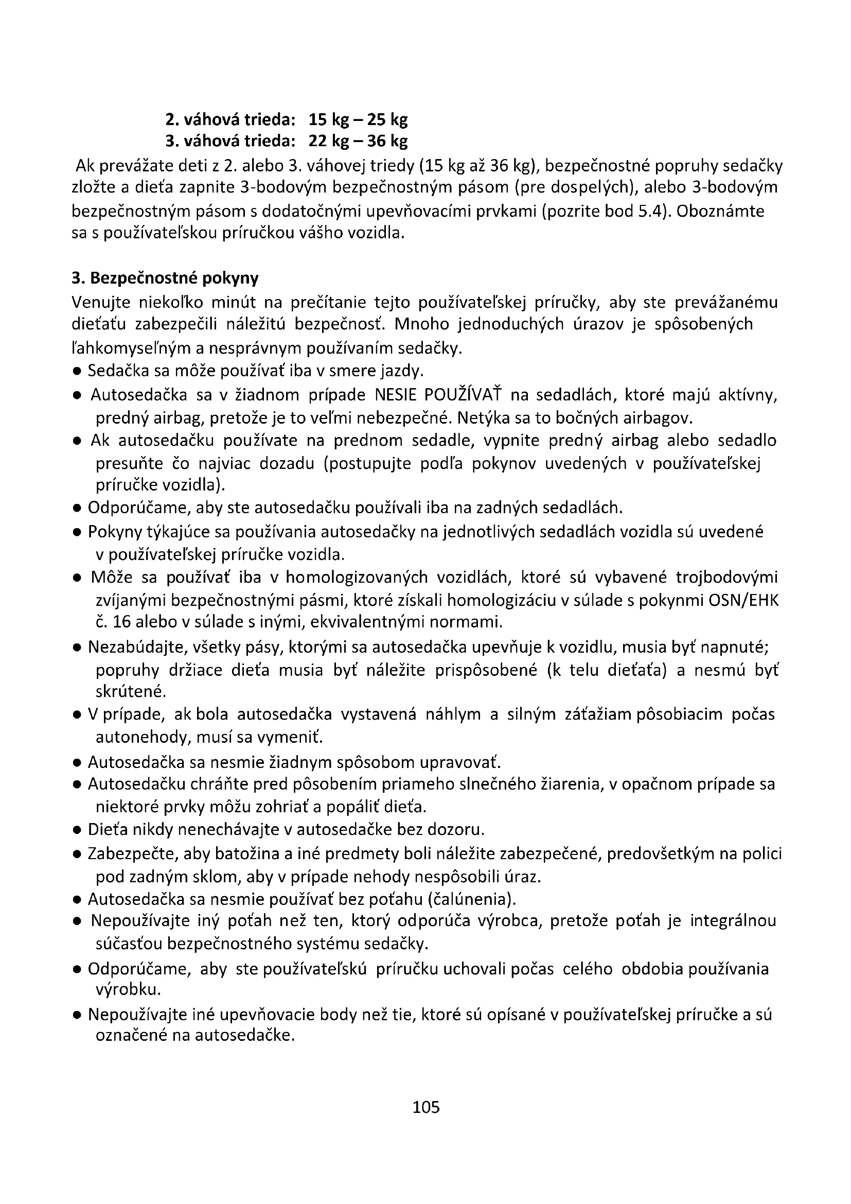 Venujte niekoľko minút na prečítanie tejto používateľskej príručky, aby ste prevážanému dieťaťu zabezpečili náležitú bezpečnosť. Mnoho jednoduchých úrazov je spôsobených ľahkomyseľným a nesprávnym používaním sedačky. ● Sedačka sa môže používať iba v smere jazdy. ● Autosedačka sa v žiadnom prípade NESIE POUŽÍVAŤ na sedadlách, ktoré majú aktívny, predný airbag, pretože je to veľmi nebezpečné. Netýka sa to bočných airbagov. ● Ak autosedačku používate na prednom sedadle, vypnite predný airbag alebo sedadlo presuňte čo najviac dozadu (postupujte podľa pokynov uvedených v používateľskej príručke vozidla). ● Odporúčame, aby ste autosedačku používali iba na zadných sedadlách. ● Pokyny týkajúce sa používania autosedačky na jednotlivých sedadlách vozidla sú uvedené v používateľskej príručke vozidla. ● Môže sa používať iba v homologizovaných vozidlách, ktoré sú vybavené trojbodovými zvíjanými bezpečnostnými pásmi, ktoré získali homologizáciu v súlade s pokynmi OSN/EHK č. 16 alebo v súlade s inými, ekvivalentnými normami. ● Nezabúdajte, všetky pásy, ktorými sa autosedačka upevňuje k vozidlu, musia byť napnuté; popruhy držiace dieťa musia byť náležite prispôsobené (k telu dieťaťa) a nesmú byť skrútené. ● V prípade, ak bola autosedačka vystavená náhlym a silným záťažiam pôsobiacim počas autonehody, musí sa vymeniť. ● Autosedačka sa nesmie žiadnym spôsobom upravovať. ● Autosedačku chráňte pred pôsobením priameho slnečného žiarenia, v opačnom prípade sa niektoré prvky môžu zohriať a popáliť dieťa. ● Dieťa nikdy nenechávajte v autosedačke bez dozoru. ● Zabezpečte, aby batožina a iné predmety boli náležite zabezpečené, predovšetkým na polici pod zadným sklom, aby v prípade nehody nespôsobili úraz. ● Autosedačka sa nesmie používať bez poťahu (čalúnenia). ● Nepoužívajte iný poťah než ten, ktorý odporúča výrobca, pretože poťah je integrálnou súčasťou bezpečnostného systému sedačky. ● Odporúčame, aby ste používateľskú príručku uchovali počas celého obdobia používania výrobku. ● Nepoužívajte iné upevňovacie body než tie, ktoré sú opísané v používateľskej príručke a sú označené na autosedačke.106 ● Všetky tvrdé prvky a plastové časti autosedačky musia byť umiestnené a namontované takým spôsobom, aby sa pri normálnom spôsobe používania vozidla nemohli pri presúvaní sedadla alebo zatváraní dverí vozidla zaseknúť. ● Pravidelne kontrolujte technický stav bezpečnostných pásov, predovšetkým kontrolujte upevňovacie miesta, švy a regulačné prvky. ● Ak sa nejaká časť sedačky poškodila alebo uvoľnila pri nehode, autosedačku ďalej nepoužívajte. ● V prípade núdzovej situácie (napr. havárie) veľmi dôležité je rýchle odopnutie bezpečnostných pásov. Znamená to, že uvoľňujúce tlačidlo pásov nie je úplne zabezpečené, zabezpečte, aby si dieťa uvedomovalo, že spona nie je určená na hranie. ● Autosedačku nepoužívajte doma. Nie je prispôsobená na používanie doma a môže sa používať iba počas cestovania autom. ● Zadná strana operadla autosedačky sa musí plocho opierať o operadlo sedadla auta. Dajte pritom pozor, aby kvôli opierke hlavy auta nevznikla medzi operadlom autosedačky a sedadlom auta nežiaduca medzera. Opierky hlavy v niektorých autách nedovoľujú, aby bola autosedačka namontovaná správne, preto sa musia pred montážou autosedačky odstrániť. ● Spona bezpečnostného pásu (pre dospelých) sa nemôže nachádzať príliš nízko spodnej časti lakťovej opierky sedačky. V prípade, ak máte nejaké pochybnosti týkajúce sa tohto bodu, obráťte sa na výrobcu autosedačky. ● Dávajte deťom dobrý príklad, preto sami vždy používajte bezpečnostné pásy. Ohrozením pre dieťa môže byť aj dospelá osoba, ktorá nie je počas jazdy pripútaná bezpečnostnými pásmi. ● Pred každým použitím auta skontrolujte, či je autosedačka upevnená správne. ● Autosedačku zabezpečte aj vtedy, keď neprevážate žiadne dieťa. Nezabezpečená sedačka môže pri núdzovom (náhlom) brzdení zraniť pasažierov.