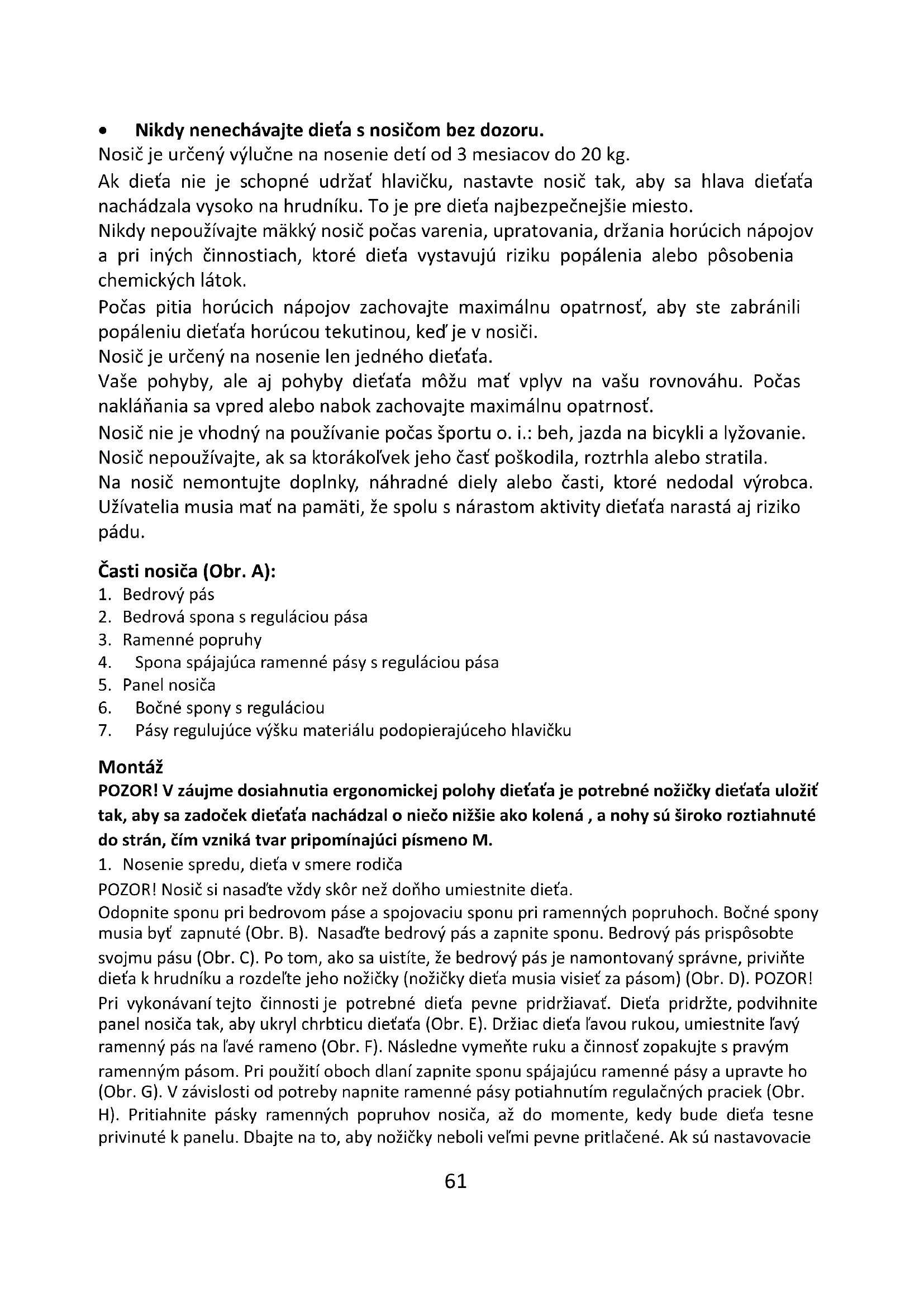 - Nikdy nenechávajte dieťa s nosičom bez dozoru. Nosič je určený výlučne na nosenie detí od 3 mesiacov do 20 kg. Ak dieťa nie je schopné udržať hlavičku, nastavte nosič tak, aby sa hlava dieťaťa nachádzala vysoko na hrudníku. To je pre dieťa najbezpečnejšie miesto. Nikdy nepoužívajte mäkký nosič počas varenia, upratovania, držania horúcich nápojov a pri iných činnostiach, ktoré dieťa vystavujú riziku popálenia alebo pôsobenia chemických látok. Počas pitia horúcich nápojov zachovajte maximálnu opatrnosť, aby ste zabránili popáleniu dieťaťa horúcou tekutinou, keď je v nosiči. Nosič je určený na nosenie len jedného dieťaťa. Vaše pohyby, ale aj pohyby dieťaťa môžu mať vplyv na vašu rovnováhu. Počas nakláňania sa vpred alebo nabok zachovajte maximálnu opatrnosť. Nosič nie je vhodný na používanie počas športu o. i.: beh, jazda na bicykli a lyžovanie. Nosič nepoužívajte, ak sa ktorákoľvek jeho časť poškodila, roztrhla alebo stratila. Na nosič nemontujte doplnky, náhradné diely alebo časti, ktoré nedodal výrobca. Užívatelia musia mať na pamäti, že spolu s nárastom aktivity dieťaťa narastá aj riziko pádu. Časti nosiča (Obr. A):