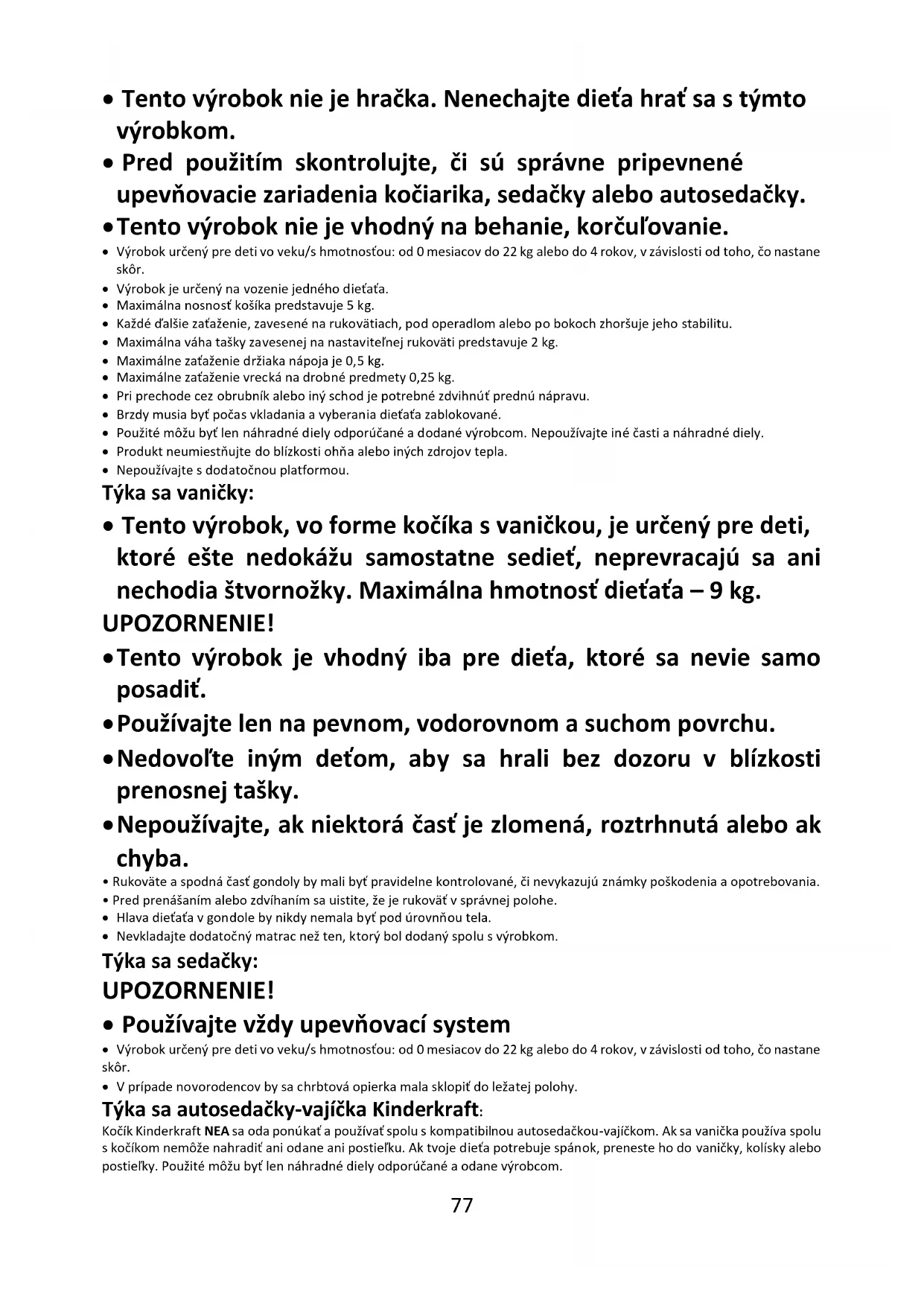 - V prípade novorodencov by sa chrbtová opierka mala sklopiť do ležatej polohy. Týka sa autosedačky-vajíčka Kinderkraft: Kočík Kinderkraft NEA sa oda ponúkať a používať spolu s kompatibilnou autosedačkou-vajíčkom. Ak sa vanička používa spolu s kočíkom nemôže nahradiť ani odane ani postieľku. Ak tvoje dieťa potrebuje spánok, preneste ho do vaničky, kolísky alebo postieľky. Použité môžu byť len náhradné diely odporúčané a odane výrobcom.78