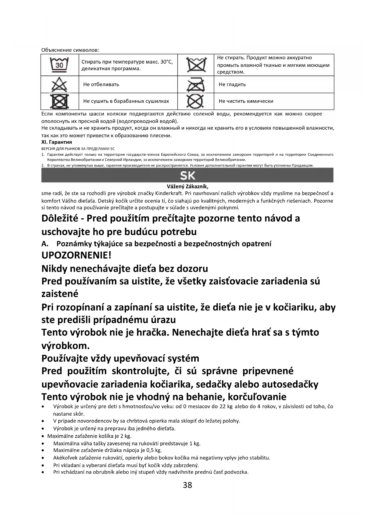 ВЕРСИЯ ДЛЯ РЫНКОВ ЗА ПРЕДЕЛАМИ ЕС 1. Гарантия действует только на территории государств-членов Европейского Союза, за исключением заморских территорий и на территории Соединенного Королевства Великобритании и Северной Ирландии, за исключением заморских территорий Великобритании. 2. В странах, не упомянутых выше, гарантия производителя не распространяется. Условия дополнительной гарантии могут быть уточнены Продавцом. Vážený Zákazník, sme radi, že ste sa rozhodli pre výrobok značky Kinderkraft. Pri navrhovaní našich výrobkov vždy myslíme na bezpečnosť a komfort Vášho dieťaťa. Detský kočík určite ocenia tí, čo siahajú po kvalitných, moderných a funkčných riešeniach. Pozorne si tento návod na používanie prečítajte a postupujte v súlade s uvedenými pokynmi. Dôležité - Pred použitím prečítajte pozorne tento návod a uschovajte ho pre budúcu potrebu A. Poznámky týkajúce sa bezpečnosti a bezpečnostných opatrení UPOZORNENIE! Nikdy nenechávajte dieťa bez dozoru Pred používaním sa uistite, že všetky zaisťovacie zariadenia sú zaistené Pri rozopínaní a zapínaní sa uistite, že dieťa nie je v kočiariku, aby ste predišli prípadnému úrazu Tento výrobok nie je hračka. Nenechajte dieťa hrať sa s týmto výrobkom. Používajte vždy upevňovací systém Pred použitím skontrolujte, či sú správne pripevnené upevňovacie zariadenia kočiarika, sedačky alebo autosedačky Tento výrobok nie je vhodný na behanie, korčuľovanie