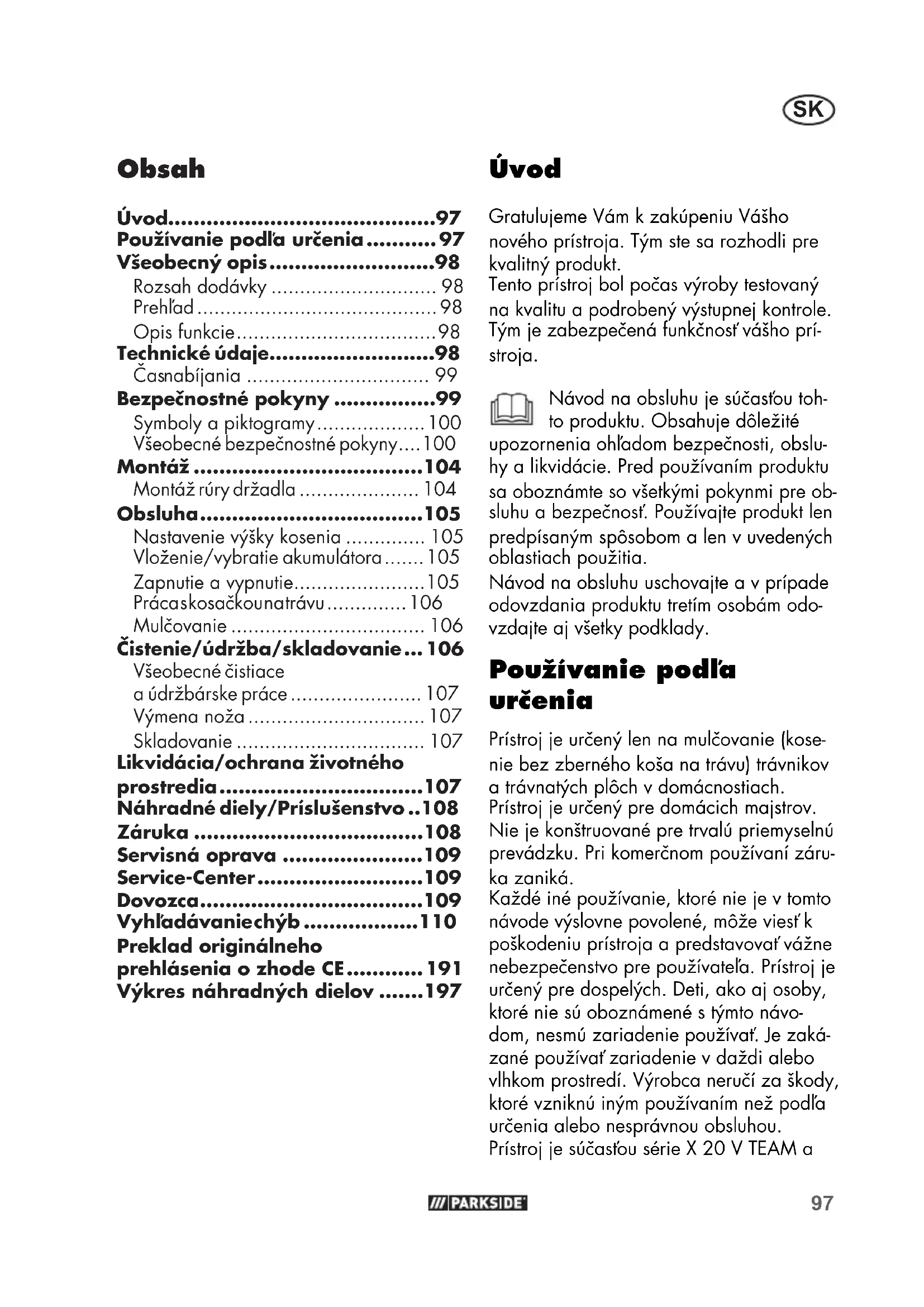 - Úvod Gratulujeme Vám k zakúpeniu Vášho nového prístroja. Tým ste sa rozhodli pre kvalitný produkt. Tento prístroj bol počas výroby testovaný na kvalitu a podrobený výstupnej kontrole. Tým je zabezpečená funkčnosť vášho prí- stroja. Návod na obsluhu je súčasťou toh- to produktu. Obsahuje dôležité upozornenia ohľadom bezpečnosti, obslu- hy a likvidácie. Pred používaním produktu sa oboznámte so všetkými pokynmi pre ob- sluhu a bezpečnosť. Používajte produkt len predpísaným spôsobom a len v uvedených oblastiach použitia. Návod na obsluhu uschovajte a v prípade odovzdania produktu tretím osobám odo- vzdajte aj všetky podklady. Používanie podľa určenia Prístroj je určený len na mulčovanie (kose- nie bez zberného koša na trávu) trávnikov a trávnatých plôch v domácnostiach. Prístroj je určený pre domácich majstrov. Nie je konštruované pre trvalú priemyselnú prevádzku. Pri komerčnom používaní záru- ka zaniká. Každé iné používanie, ktoré nie je v tomto návode výslovne povolené, môže viesť k poškodeniu prístroja a predstavovať vážne nebezpečenstvo pre používateľa. Prístroj je určený pre dospelých. Deti, ako aj osoby, ktoré nie sú oboznámené s týmto návo- dom, nesmú zariadenie používať. Je zaká- zané používať zariadenie v daždi alebo vlhkom prostredí. Výrobca neručí za škody, ktoré vzniknú iným používaním než podľa určenia alebo nesprávnou obsluhou. Prístroj je súčasťou série X20VTEAM a Preklad originálneho prehlásenia o zhode CE p. 191
