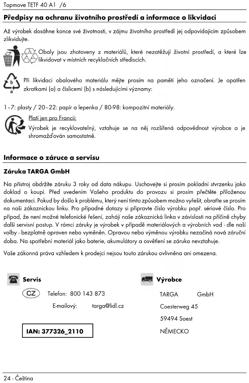 - držiak na dáždnik alebo vychádzkovú palicu (z vonkajšej strany tašky). Čistenie a skladovanie Nákupný vozík čistite mierne navlhčenou handričkou. Nikdy nepoužívajte žiadne rozpúšťadlá, ani čistiace prostriedky, ktoré by mohli poškodiť plastový kryt. Pri ťažko odstrániteľnej špine naneste na vlhkú handričku trochu čistiaceho prostriedku. Potom vysušte nákupný vozík suchou handričkou. Ak nechcete nákupný vozík dlhšiu dobu používať, vyberte všetok obsah. Odložte nákupný vozík na čisté a suché miesto mimo priameho slnečného žiarenia.Topmove TETF 40 A1 /6 Slovensky – 27 Informácie o environmentálnych nariadeniach a likvidácii V záujme ochrany životného prostredia zlikvidujte produkt na konci jeho životnosti správnym spôsobom. Obal je vyrobený z materiálov šetriacich životné prostredie a môžete ho zlikvidovať v miestnom recyklačnom centre. Pri likvidácia obalového materiálu si na ňom všimnite označenia. Na štítku sú označené skratky (a) a čísla (b), a ich význam je nasledovný: 1 – 7: plast/ 20 – 22: papier a kartón / 80 – 98: kompozitné materiály. Len pre Francúzsko: Výrobok je recyklovateľný, vzťahuje sa naň rozšírená zodpovednosť výrobcu a podlieha samostatnému zberu. Informácie o záruke a servise Záruka spoločnosti TARGA GmbH Na tento prístroj máte trojročnú záruku od dátumu nákupu. Uschovajte si originál pokladničného bloku ako doklad o kúpe. Pred uvedením výrobku do prevádzky si prečítajte priloženú dokumentáciu. Ak by sa vyskytol problém, ktorý sa takýmto spôsobom nedá vyriešiť, obráťte sa na našu zákaznícku linku. Pri každej požiadavke majte poruke účtenku a číslo výrobku príp. jeho výrobné číslo. V prípade, že telefonické vyriešenie nie je možné, v závislosti od príčiny chyby zákaznícky servis zariadi ďalšie služby. Počas záruky vám v prípade materiálovej alebo výrobnej chyby výrobok podľa našej úvahy bezplatne vymeníme alebo opravíme. Opravou ani výmenou výrobku nezačína plynúť nová záručná doba. Záruka neplatí na spotrebný materiál, ako sú batérie, akumulátory a žiarovky. Táto záruka neovplyvňuje ani neobmedzuje vaše zákonné práva voči predávajúcemu.