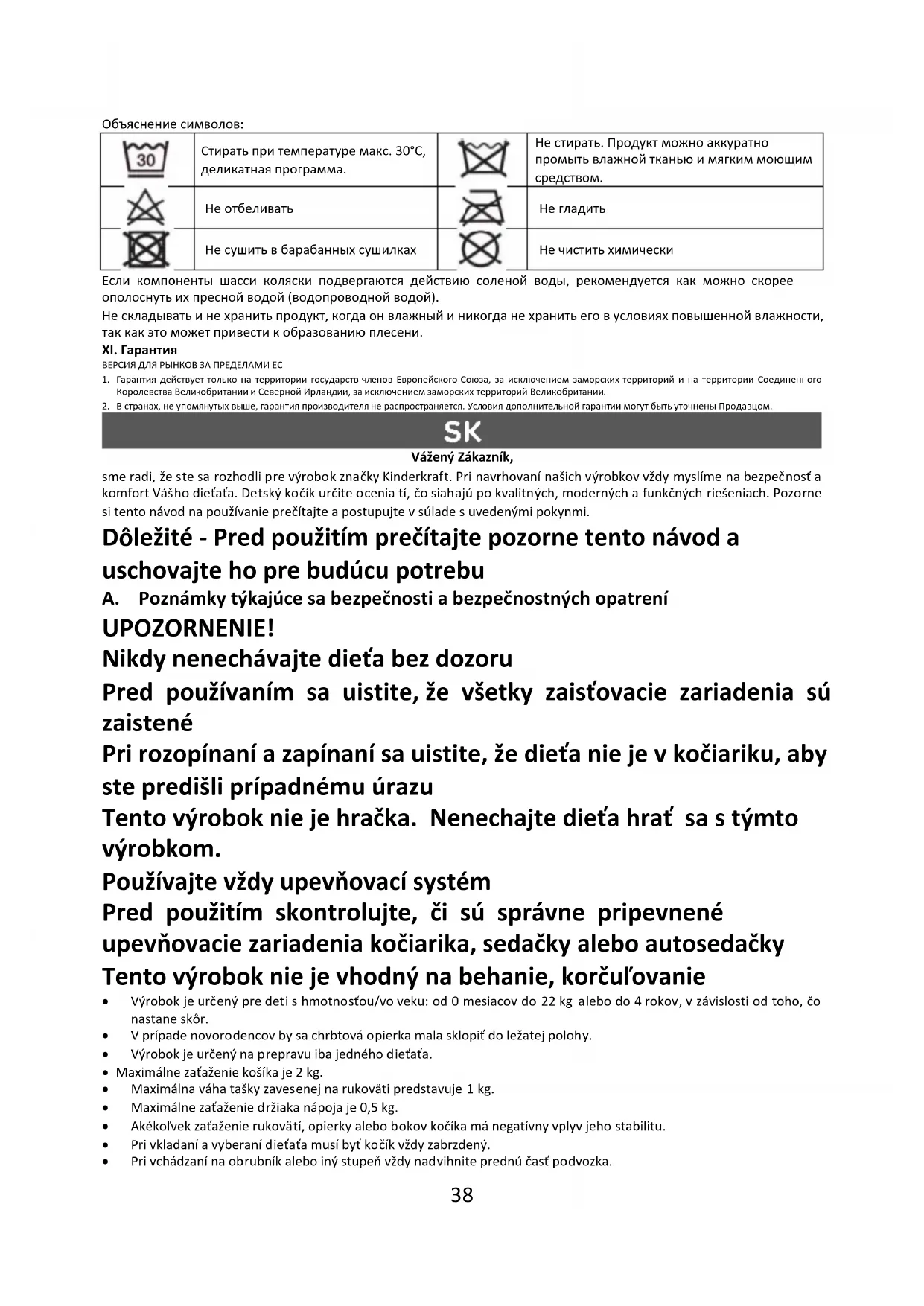 ВЕРСИЯ ДЛЯ РЫНКОВ ЗА ПРЕДЕЛАМИ ЕС 1. Гарантия действует только на территории государств-членов Европейского Союза, за исключением заморских территорий и на территории Соединенного Королевства Великобритании и Северной Ирландии, за исключением заморских территорий Великобритании. 2. В странах, не упомянутых выше, гарантия производителя не распространяется. Условия дополнительной гарантии могут быть уточнены Продавцом. Vážený Zákazník, sme radi, že ste sa rozhodli pre výrobok značky Kinderkraft. Pri navrhovaní našich výrobkov vždy myslíme na bezpečnosť a komfort Vášho dieťaťa. Detský kočík určite ocenia tí, čo siahajú po kvalitných, moderných a funkčných riešeniach. Pozorne si tento návod na používanie prečítajte a postupujte v súlade s uvedenými pokynmi. Dôležité - Pred použitím prečítajte pozorne tento návod a uschovajte ho pre budúcu potrebu A. Poznámky týkajúce sa bezpečnosti a bezpečnostných opatrení UPOZORNENIE! Nikdy nenechávajte dieťa bez dozoru Pred používaním sa uistite, že všetky zaisťovacie zariadenia sú zaistené Pri rozopínaní a zapínaní sa uistite, že dieťa nie je v kočiariku, aby ste predišli prípadnému úrazu Tento výrobok nie je hračka. Nenechajte dieťa hrať sa s týmto výrobkom. Používajte vždy upevňovací systém Pred použitím skontrolujte, či sú správne pripevnené upevňovacie zariadenia kočiarika, sedačky alebo autosedačky Tento výrobok nie je vhodný na behanie, korčuľovanie
