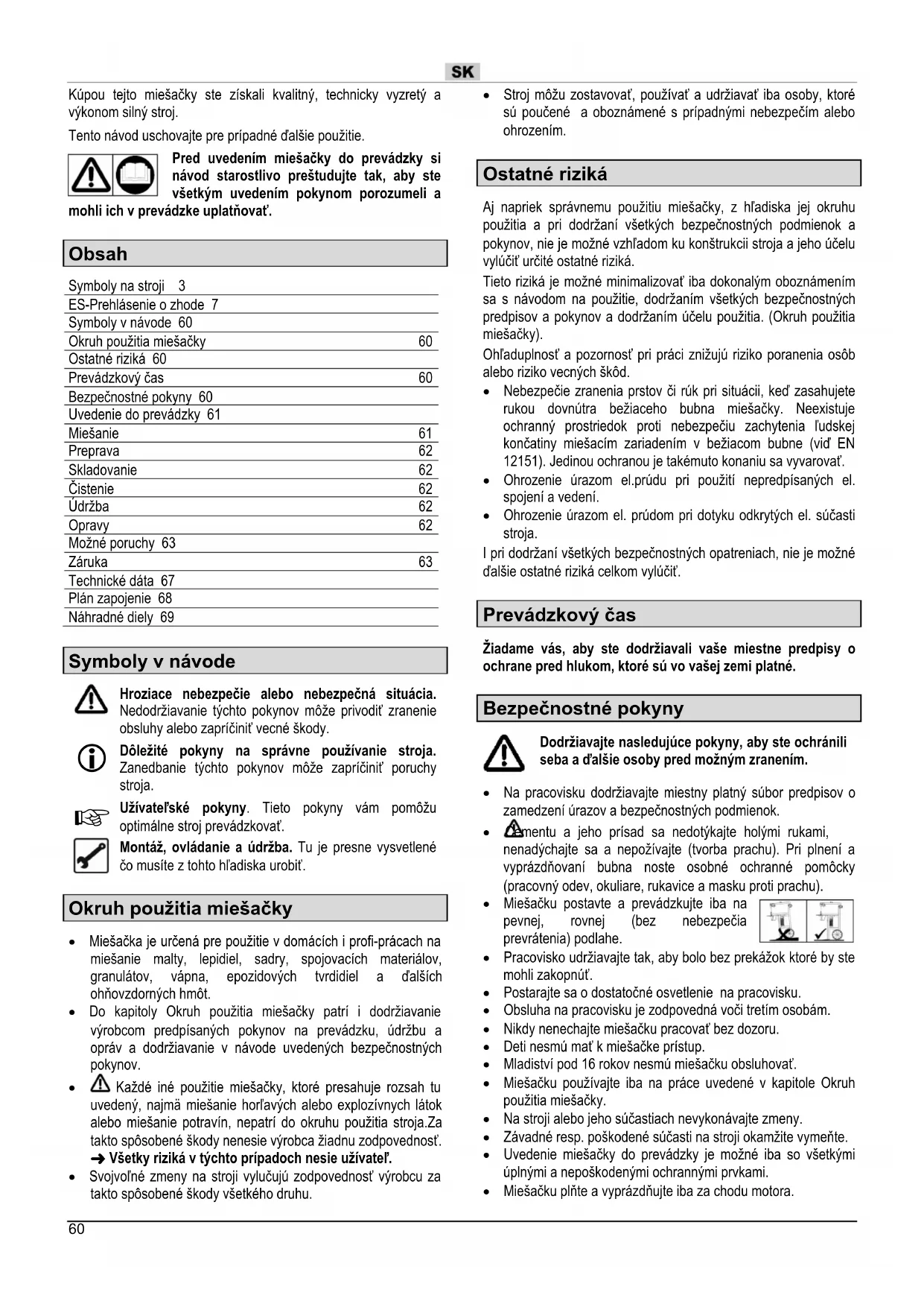 Obsah Symboly na stroji 3 ES-Prehlásenie o zhode 7 Symboly v návode 60 Okruh použitia miešačky 60 Ostatné riziká 60 Prevádzkový čas 60 Bezpečnostné pokyny 60 Uvedenie do prevádzky 61 Miešanie 61 Preprava 62 Skladovanie 62 Čistenie 62 Údržba 62 Opravy 62 Možné poruchy 63 Záruka 63 Technické dáta 67 Plán zapojenie 68 Náhradné diely 69