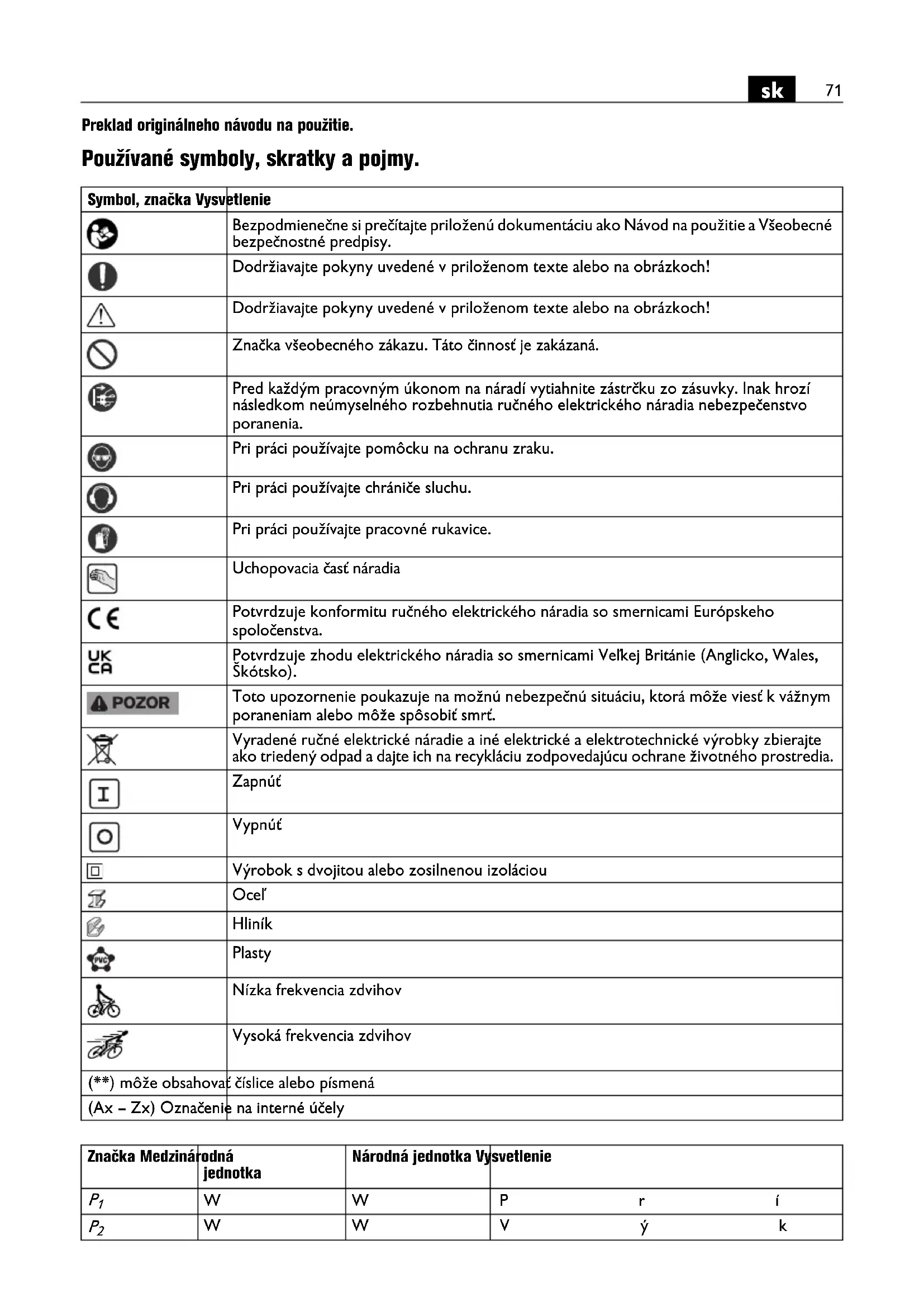 Preklad originálneho návodu na použitie. Používané symboly, skratky a pojmy. Symbol, značka Vysvetlenie Bezpodmienečne si prečítajte priloženú dokumentáciu ako Návod na použitie a Všeobecné bezpečnostné predpisy. Dodržiavajte pokyny uvedené v priloženom texte alebo na obrázkoch! Dodržiavajte pokyny uvedené v priloženom texte alebo na obrázkoch! Značka všeobecného zákazu. Táto činnosť je zakázaná. Pred každým pracovným úkonom na náradí vytiahnite zástrčku zo zásuvky. Inak hrozí následkom neúmyselného rozbehnutia ručného elektrického náradia nebezpečenstvo poranenia. Pri práci používajte pomôcku na ochranu zraku. Pri práci používajte chrániče sluchu. Pri práci používajte pracovné rukavice. Uchopovacia časť náradia Potvrdzuje konformitu ručného elektrického náradia so smernicami Európskeho spoločenstva. Potvrdzuje zhodu elektrického náradia so smernicami Veľkej Británie (Anglicko, Wales, Škótsko). Toto upozornenie poukazuje na možnú nebezpečnú situáciu, ktorá môže viesť k vážnym poraneniam alebo môže spôsobiť smrť. Vyradené ručné elektrické náradie a iné elektrické a elektrotechnické výrobky zbierajte ako triedený odpad a dajte ich na recykláciu zodpovedajúcu ochrane životného prostredia. Zapnúť Vypnúť Výrobok s dvojitou alebo zosilnenou izoláciou Oceľ Hliník Plasty Nízka frekvencia zdvihov Vysoká frekvencia zdvihov (**) môže obsahovať číslice alebo písmená (Ax – Zx) Označenie na interné účely Značka Medzinárodná jednotka Národná jednotka Vysvetlenie