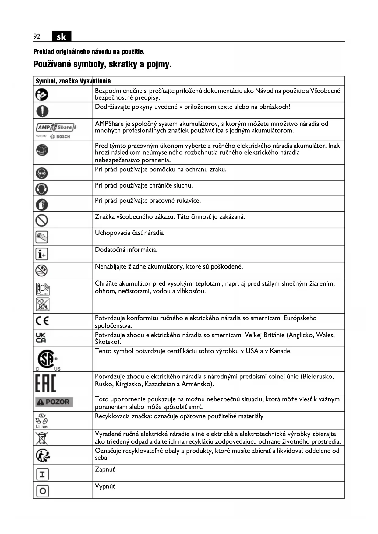 Preklad originálneho návodu na použitie. Používané symboly, skratky a pojmy. Symbol, značka Vysvetlenie Bezpodmienečne si prečítajte priloženú dokumentáciu ako Návod na použitie a Všeobecné bezpečnostné predpisy. Dodržiavajte pokyny uvedené v priloženom texte alebo na obrázkoch! AMPShare je spoločný systém akumulátorov, s ktorým môžete množstvo náradia od mnohých profesionálnych značiek používať iba s jedným akumulátorom. Pred týmto pracovným úkonom vyberte z ručného elektrického náradia akumulátor. Inak hrozí následkom neúmyselného rozbehnutia ručného elektrického náradia nebezpečenstvo poranenia. Pri práci používajte pomôcku na ochranu zraku. Pri práci používajte chrániče sluchu. Pri práci používajte pracovné rukavice. Značka všeobecného zákazu. Táto činnosť je zakázaná. Uchopovacia časť náradia Dodatočná informácia. Nenabíjajte žiadne akumulátory, ktoré sú poškodené. Chráňte akumulátor pred vysokými teplotami, napr. aj pred stálym slnečným žiarením, ohňom, nečistotami, vodou a vlhkosťou. Potvrdzuje konformitu ručného elektrického náradia so smernicami Európskeho spoločenstva. Potvrdzuje zhodu elektrického náradia so smernicami Veľkej Británie (Anglicko, Wales, Škótsko). Tento symbol potvrdzuje certifikáciu tohto výrobku v USA a v Kanade. Potvrdzuje zhodu elektrického náradia s národnými predpismi colnej únie (Bielorusko, Rusko, Kirgizsko, Kazachstan a Arménsko). Toto upozornenie poukazuje na možnú nebezpečnú situáciu, ktorá môže viesť k vážnym poraneniam alebo môže spôsobiť smrť. Recyklovacia značka: označuje opätovne použiteľné materiály Vyradené ručné elektrické náradie a iné elektrické a elektrotechnické výrobky zbierajte ako triedený odpad a dajte ich na recykláciu zodpovedajúcu ochrane životného prostredia. Označuje recyklovateľné obaly a produkty, ktoré musíte zbierať a likvidovať oddelene od seba. Zapnúť Vypnúť max.50°C93