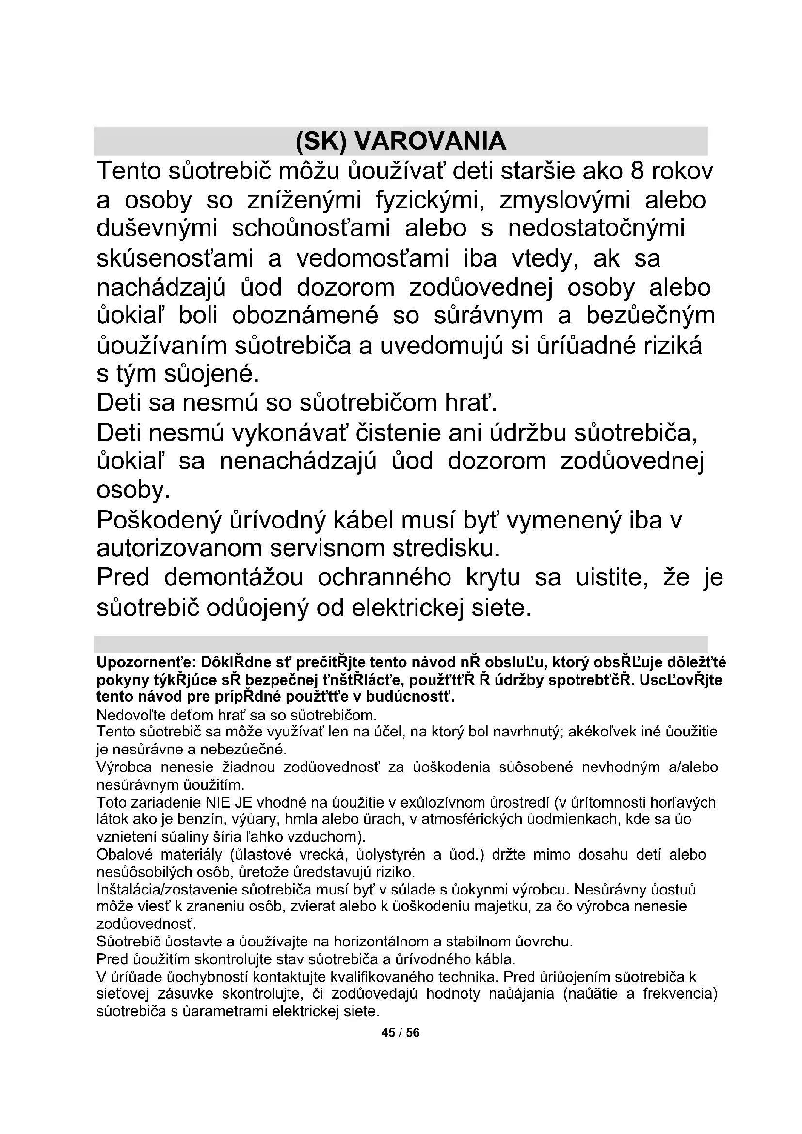 (SK) VAROVANIA Tento spotrebič môžu používať deti staršie ako 8 rokov a osoby so zníženými fyzickými, zmyslovými alebo duševnými schopnosťami alebo s nedostatočnými skúsenosťami a vedomosťami iba vtedy, ak sa nachádzajú pod dozorom zodpovednej osoby alebo pokiaľ boli oboznámené so správnym a bezpečným používaním spotrebiča a uvedomujú si prípadné riziká s tým spojené. Deti sa nesmú so spotrebičom hrať. Deti nesmú vykonávať čistenie ani údržbu spotrebiča, pokiaľ sa nenachádzajú pod dozorom zodpovednej osoby. Poškodený prívodný kábel musí byť vymenený iba v autorizovanom servisnom stredisku. Pred demontážou ochranného krytu sa uistite, že je spotrebič odpojený od elektrickej siete.