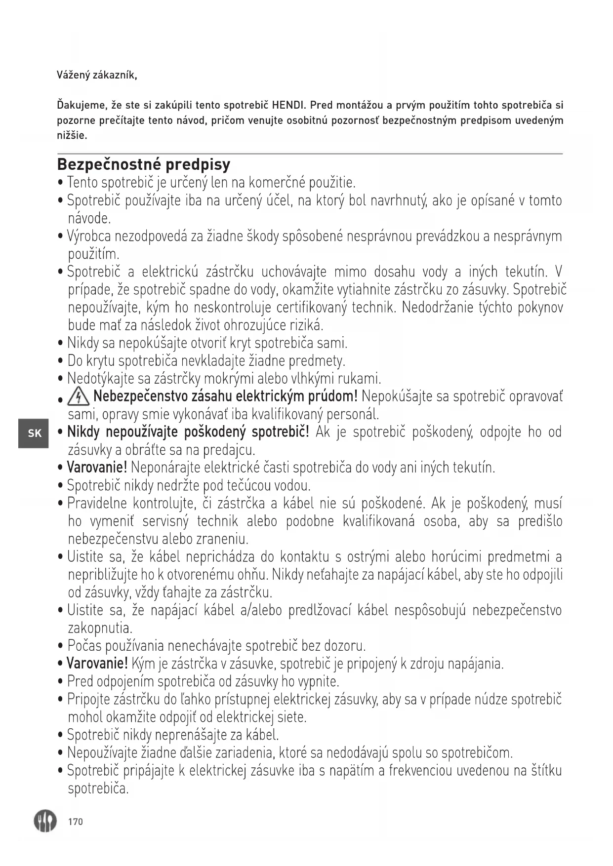 Vážený zákazník, Ďakujeme, že ste si zakúpili tento spotrebič HENDI. Pred montážou a prvým použitím tohto spotrebiča si pozorne prečítajte tento návod, pričom venujte osobitnú pozornosť bezpečnostným predpisom uvedeným nižšie. Bezpečnostné predpisy
