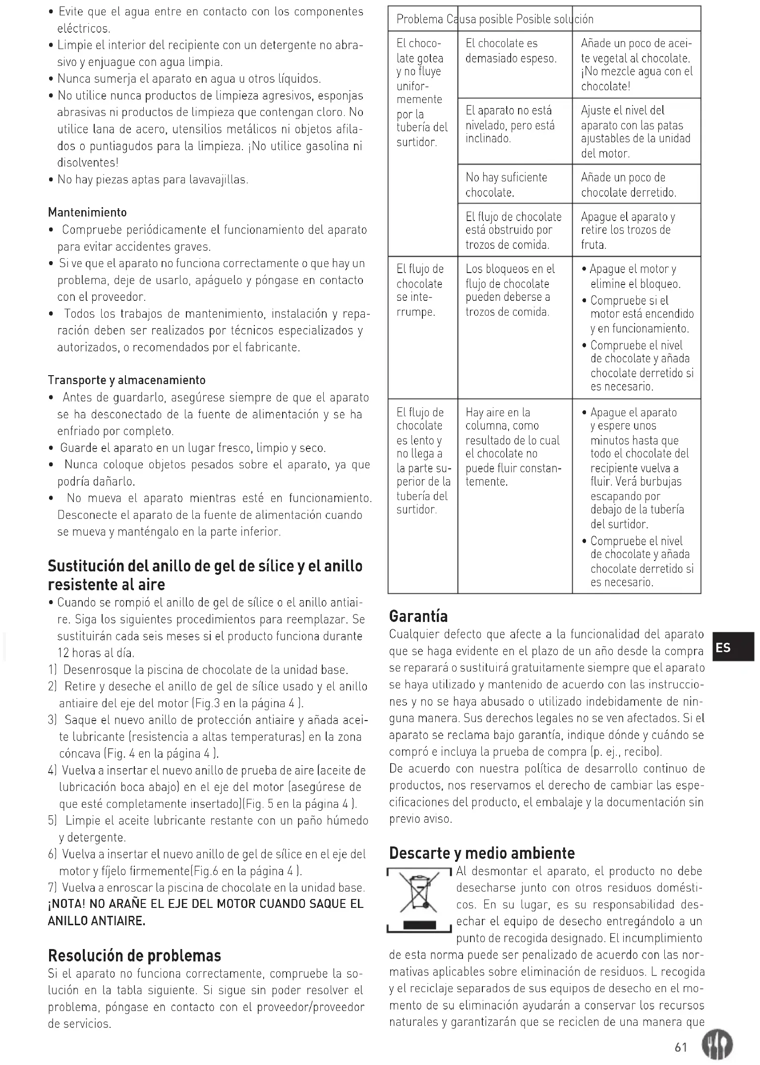 Skontrolujte hladinu čokolády a v prípade potreby pridajte rozto- penú čokoládu. Záruka Všetky chyby ovplyvňujúce funkčnosť spotrebiča, ktoré sa ob- javia do jedného roka po zakúpení, budú opravené bezplat- nou opravou alebo výmenou za predpokladu, že spotrebič bol použitý a udržiavaný v súlade s pokynmi a že nebol nijakým spôsobom zneužitý ani nesprávne použitý. Vaše zákonné práva nie sú ovplyvnené. Ak sa na spotrebič vzťahuje záruka, uveďte, kde a kedy bol zakúpený a uveďte doklad o kúpe (napr. po- tvrdenie). V súlade s našimi zásadami neustáleho vývoja produktov si vyhradzujeme právo zmeniť špecifikácie produktu, balenia a dokumentácie bez predchádzajúceho upozornenia. Likvidácia a životné prostredie Pri vyraďovaní spotrebiča z prevádzky sa výrobok nesmie likvidovať s iným komunálnym odpa- dom. Namiesto toho je vašou zodpovednosťou zlikvidovať odpadové zariadenie jeho odovzda- ním na určenom zbernom mieste. Nedodržanie65