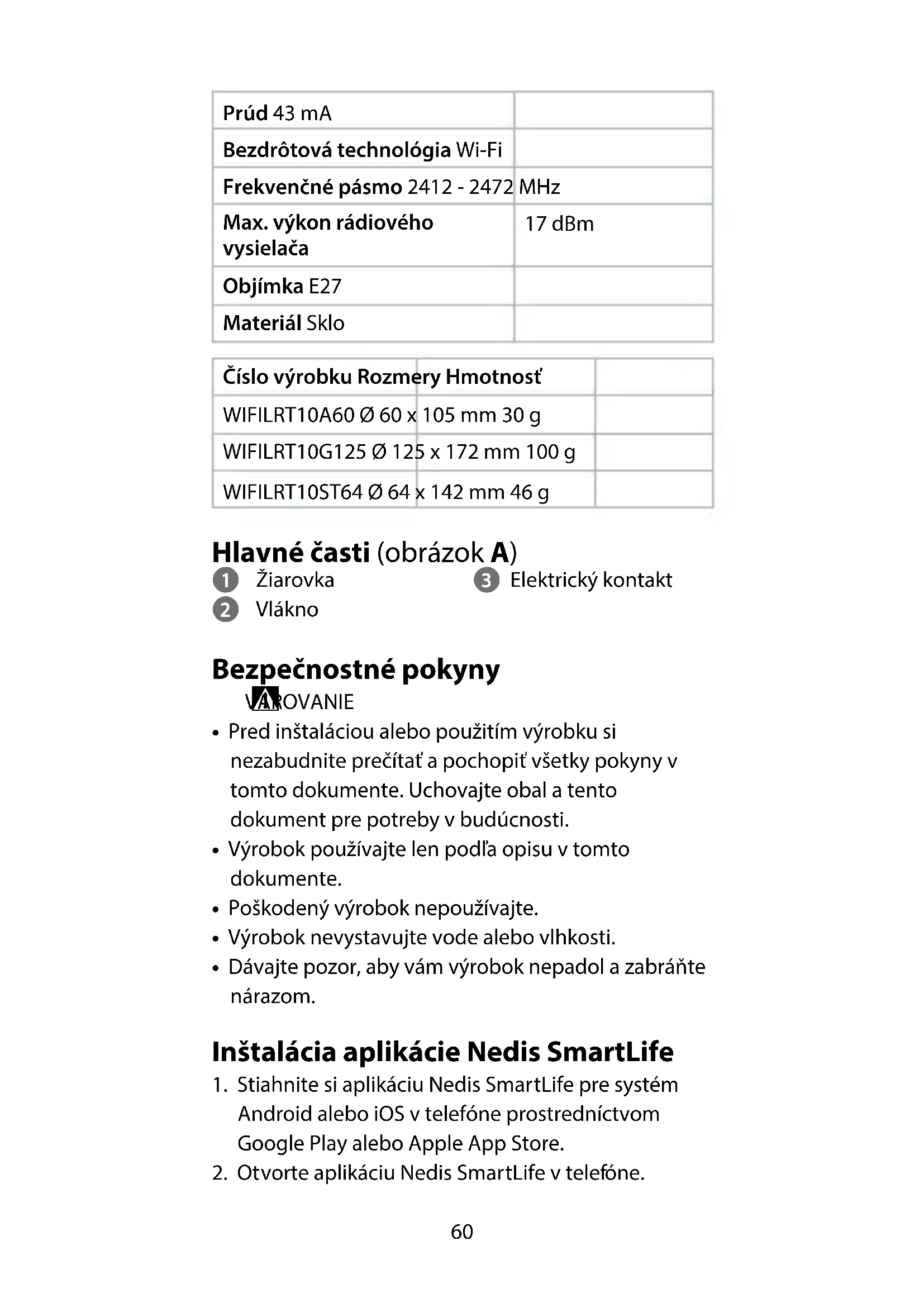 Rýchly návod Inteligentná žiarovka s funkciou Wi-Fi WIFILRT10A60 WIFILRT10G125 WIFILRT10ST64 Viac informácií nájdete v rozšírenom návode online:ned.is/wilrt10a60 ned.is/wilrt10g125 ned.is/wilrt10st64 Určené použitie Nedis WIFILRT10A60 | WIFILRT10G125 | WIFILRT10ST64 je žiarovka, ktorá umožňuje bezdrôtovo ovládať svetlo. Výrobok je výhradne určené na osvetlenie vnútorného a vonkajšieho prostredia. Výrobok je určený na ovládanie výhradne prostredníctvom aplikácie Nedis SmartLife. Každá zmena výrobku môže mať následky na bezpečnosť, záruku a správne fungovanie. Technické údaje Produkt Inteligentná žiarovka s funkciou Wi-Fi Jas 806 lm Farba svetla 2700 - 6500 K Napájanie 220 - 240 V ~ 50 / 60 Hz Príkon 5 W60 Prúd 43 mA Bezdrôtová technológia Wi-Fi Frekvenčné pásmo 2412 - 2472 MHz Max. výkon rádiového vysielača 17 dBm Objímka E27 Materiál Sklo Číslo výrobku Rozmery Hmotnosť WIFILRT10A60 Ø 60 x 105 mm 30 g WIFILRT10G125 Ø 125 x 172 mm 100 g WIFILRT10ST64 Ø 64 x 142 mm 46 g Hlavné časti (obrázok A) 1 Žiarovka 2 Vlákno 3 Elektrický kontakt Bezpečnostné pokyny