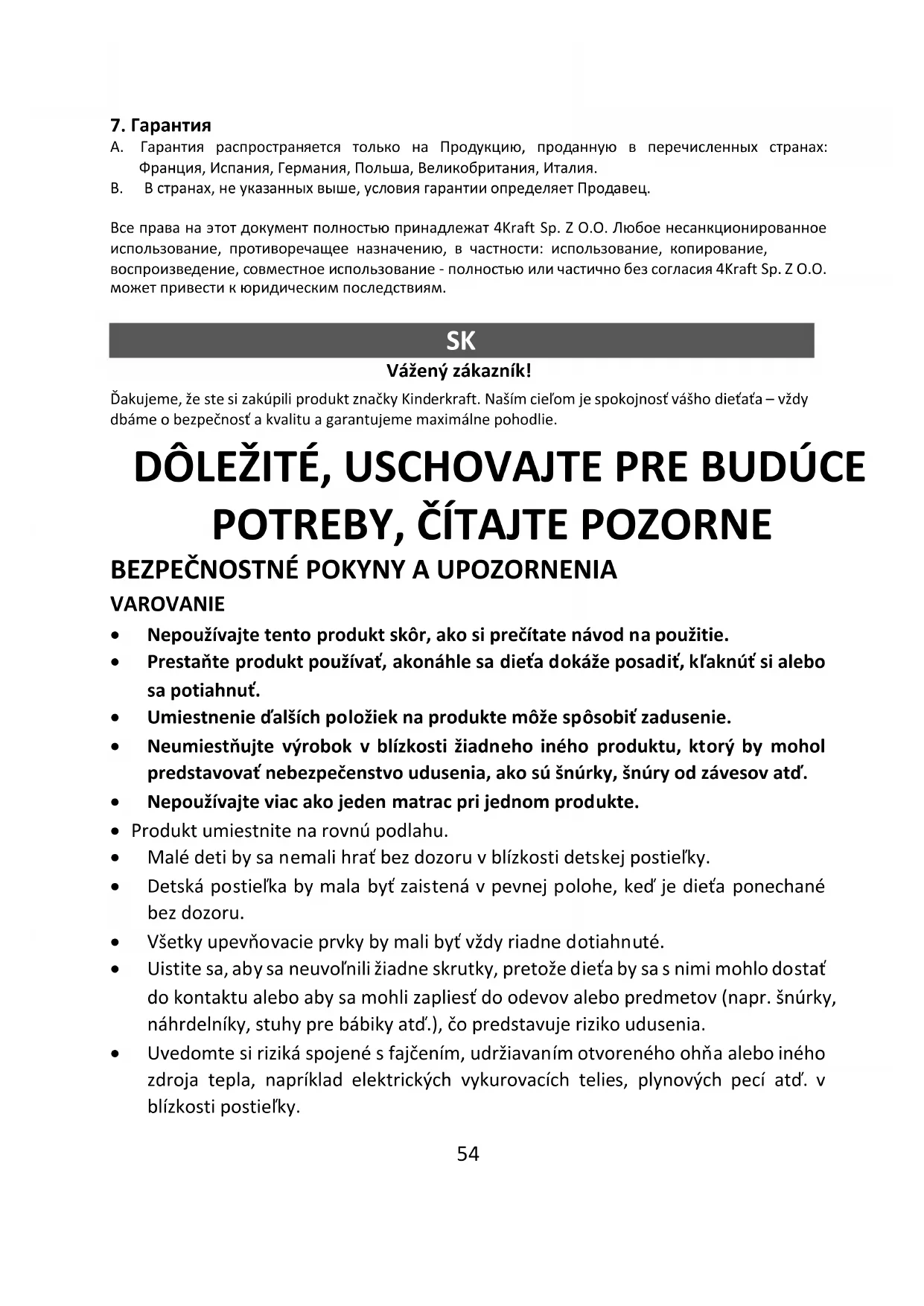 - NEPOUŽÍVAJTE detskú postieľku, ak nejaké časti chýbajú, sú poškodené alebo zlomené. V prípade potreby kontaktujte spoločnosť 4Kraft Sp. z o.o. za účelom získania náhradných dielov a používateľských manuálov. NENAHRÁDZAJTE diely.