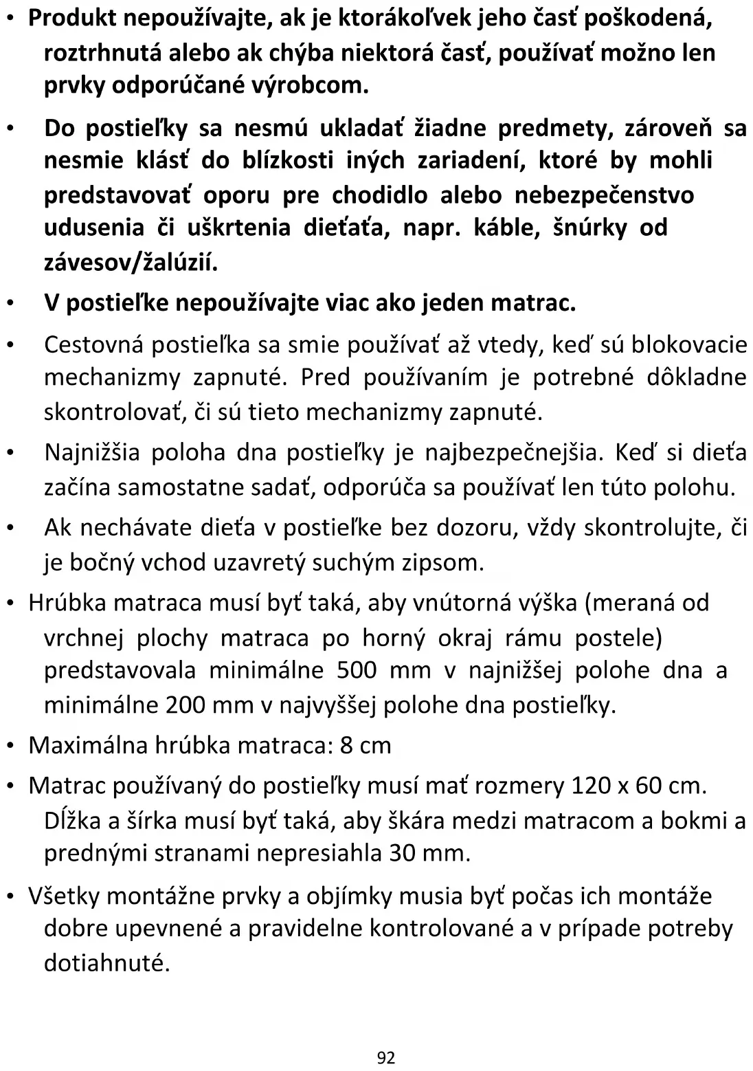 - Do postieľky sa nesmú ukladať žiadne predmety, zároveň sa nesmie klásť do blízkosti iných zariadení, ktoré by mohli predstavovať oporu pre chodidlo alebo nebezpečenstvo udusenia či uškrtenia dieťaťa, napr. káble, šnúrky od závesov/žalúzií.