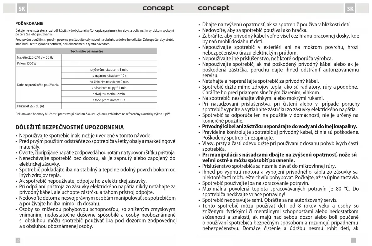 UPOZORNENIE Pred zostavením spotrebiča a odnímaním príslušenstva najprv vytiahnite zástrčku zo zásuvky elektrického napätia! Prv než uvediete nový spotrebič do činnosti, mali by ste ho z hygienických dôvodov pretrieť vlhkou handričkou avšetky odnímateľné časti umyť v teplej vode. Spotrebič je určený na krátkodobú činnosť. Spotrebič nepoužívajte nepretržite dlhšie, než je uvedené vtabuľke technických parametrov. Pred ďalším použitím treba nechať spotrebič vychladnúť. MIXOVANIE Tyčový násadec je určený na prípravu omáčok, poliev, polievok, majonézy, detského jedla, miešaných nápojov a mliečnych koktailov.