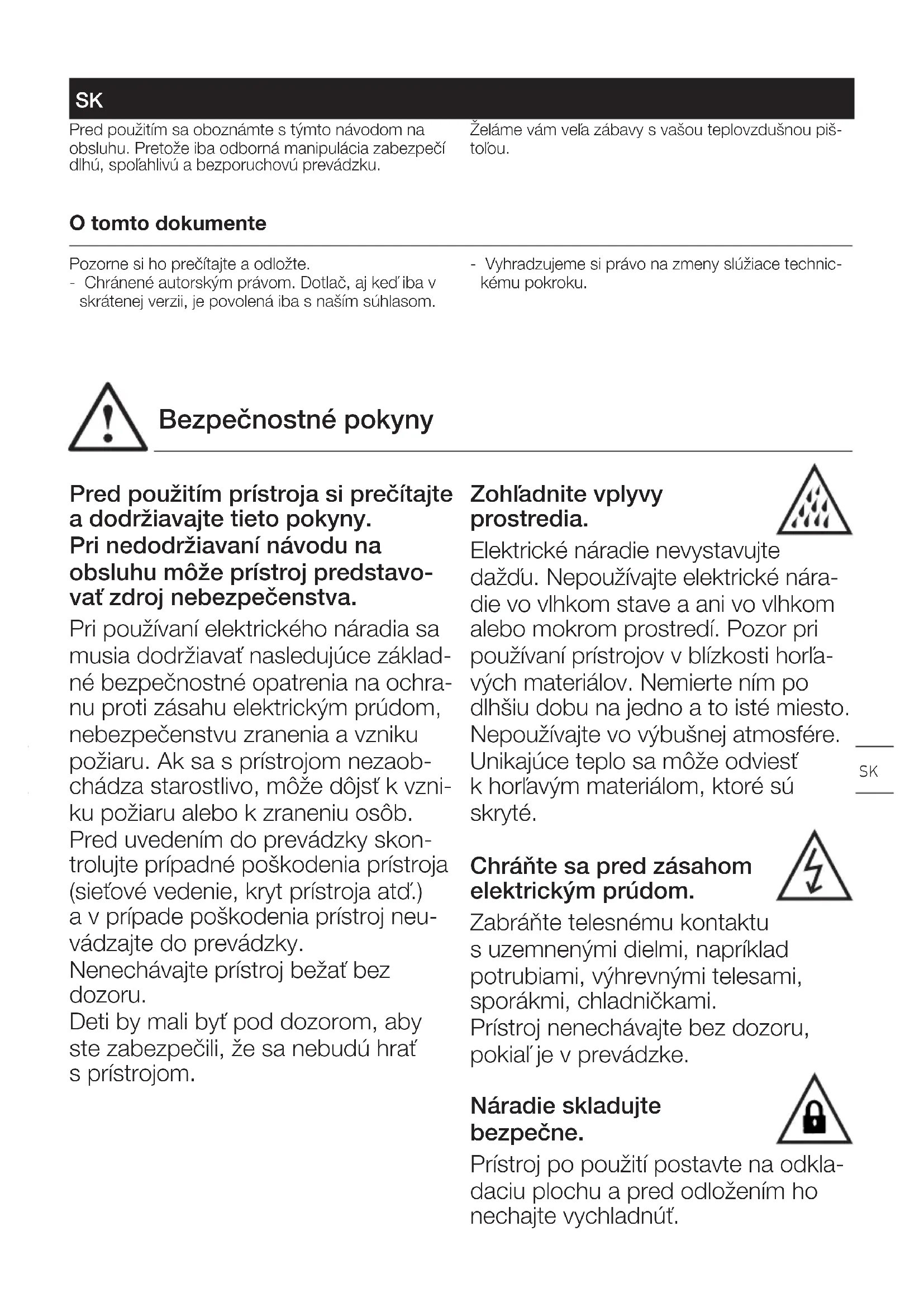 Bezpečnostné pokyny Pred použitím sa oboznámte s týmto návodom na obsluhu. Pretože iba odborná manipulácia zabezpečí dlhú, spoľahlivú a bezporuchovú prevádzku. Želáme vám veľa zábavy s vašou teplovzdušnou piš- toľou. SKPreklad originálneho návodu na obsluhu O tomto dokumente Pozorne si ho prečítajte a odložte. - Chránené autorským právom. Dotlač, aj keď iba v skrátenej verzii, je povolená iba snaším súhlasom. - Vyhradzujeme si právo na zmeny slúžiace technic- kému pokroku. Pred použitím prístroja si prečítajte a dodržiavajte tieto pokyny. Pri nedodržiavaní návodu na obsluhu môže prístroj predstavo- vať zdroj nebezpečenstva. Pri používaní elektrického náradia sa musia dodržiavať nasledujúce základ- né bezpečnostné opatrenia na ochra- nu proti zásahu elektrickým prúdom, nebezpečenstvu zranenia avzniku požiaru. Ak sa sprístrojom nezaob- chádza starostlivo, môže dôjsť k vzni- ku požiaru alebo kzraneniu osôb. Pred uvedením do prevádzky skon- trolujte prípadné poškodenia prístroja (sieťové vedenie, kryt prístroja atď.) avprípade poškodenia prístroj neu- vádzajte do prevádzky. Nenechávajte prístroj bežať bez dozoru. Deti by mali byť pod dozorom, aby ste zabezpečili, že sa nebudú hrať sprístrojom. Zohľadnite vplyvy prostredia. Elektrické náradie nevystavujte dažďu. Nepoužívajte elektrické nára- die vo vlhkom stave a ani vo vlhkom alebo mokrom prostredí. Pozor pri používaní prístrojov vblízkosti horľa- vých materiálov. Nemierte ním po dlhšiu dobu na jedno a to isté miesto. Nepoužívajte vo výbušnej atmosfére. Unikajúce teplo sa môže odviesť khorľavým materiálom, ktoré sú skryté. Chráňte sa pred zásahom elektrickým prúdom. Zabráňte telesnému kontaktu suzemnenými dielmi, napríklad potrubiami, výhrevnými telesami, sporákmi, chladničkami. Prístroj nenechávajte bez dozoru, pokiaľ je vprevádzke. Náradie skladujte bezpečne. Prístroj po použití postavte na odkla- daciu plochu apred odložením ho nechajte vychladnúť.