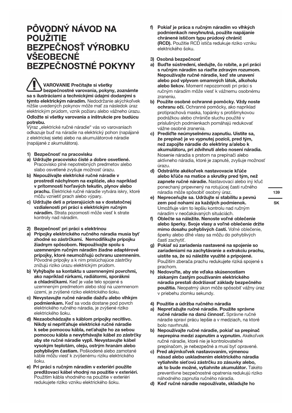NAVODILA VAROVANIE Prečítajte si všetky bezpečnostné varovania, pokyny, zoznámte sa s ilustráciami a technickými údajmi dodanými s týmto elektrickým náradím. Nedodržanie akýchkoľvek nižšie uvedených pokynov môže mať za následok úraz elektrickým prúdom, vznik požiaru alebo vážneho úrazu. Odložte si všetky varovania a inštrukcie pre budúcu potrebu. Výraz „elektrické ručné náradie“ vás vo varovaniach odkazuje buď na náradie na elektrický pohon (napájané z elektrickej siete) alebo na akumulátorové náradie (napájané z akumulátora).