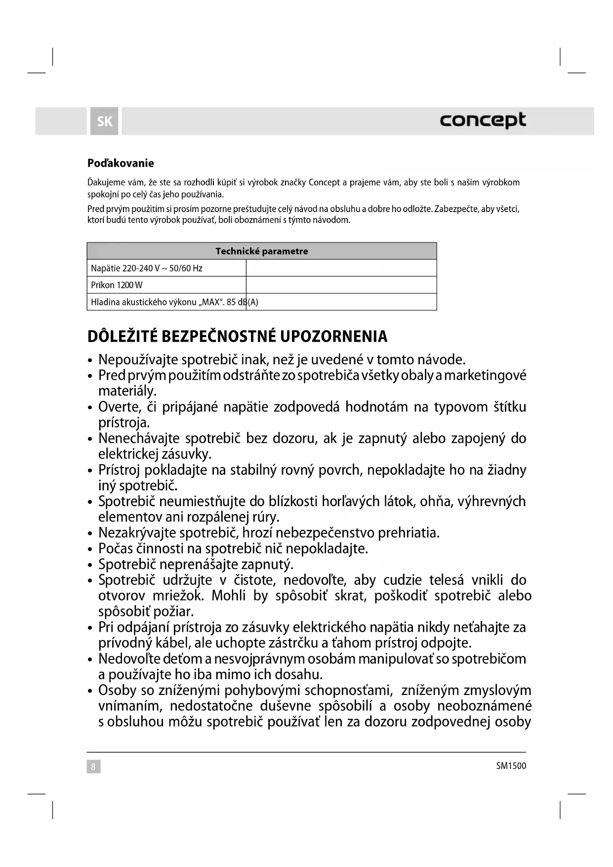 Poďakovanie Ďakujeme vám, že ste sa rozhodli kúpiť si výrobok značky Concept a prajeme vám, aby ste boli s naším výrobkom spokojní po celý čas jeho používania. Pred prvým použitím si prosím pozorne preštudujte celý návod naobsluhu a dobre ho odložte. Zabezpečte, aby všetci, ktorí budú tento výrobok používať, boli oboznámení stýmto návodom. Technické parametre Napätie 220-240 V ~ 50/60 Hz Príkon 1200 W Hladina akustického výkonu „MAX“. 85 dB(A)