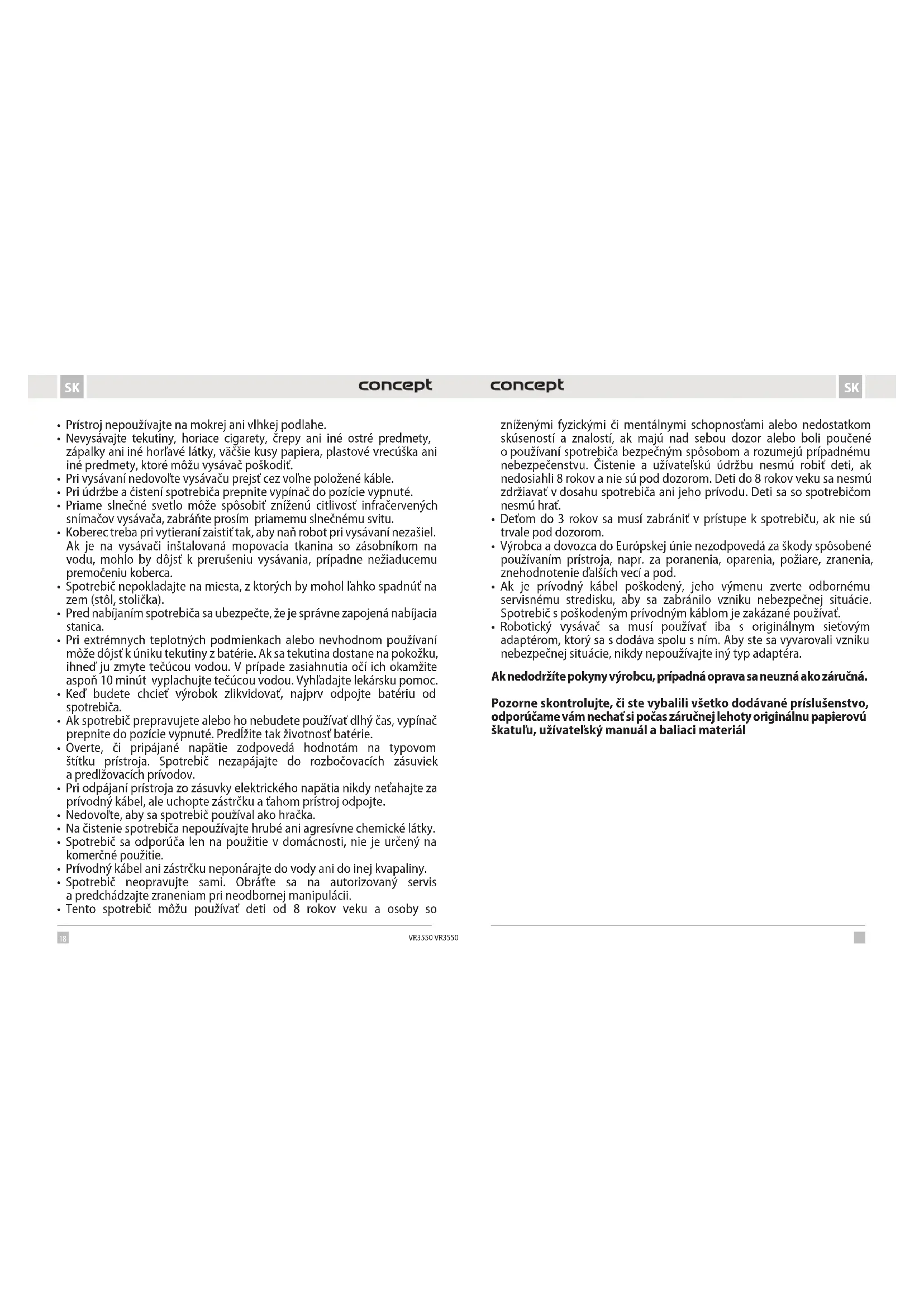 - Robotický vysávač sa musí používať iba s originálnym sieťovým adaptérom, ktorý sa sdodáva spolu s ním. Aby ste sa vyvarovali vzniku nebezpečnej situácie, nikdy nepoužívajte iný typ adaptéra. Ak nedodržíte pokyny výrobcu, prípadná oprava sa neuzná ako záručná. Pozorne skontrolujte, či ste vybalili všetko dodávané príslušenstvo, odporúčame vám nechať si počas záručnej lehoty originálnu papierovú škatuľu, užívateľský manuál a baliaci materiál20 21 SKSK VR3550 VR3550