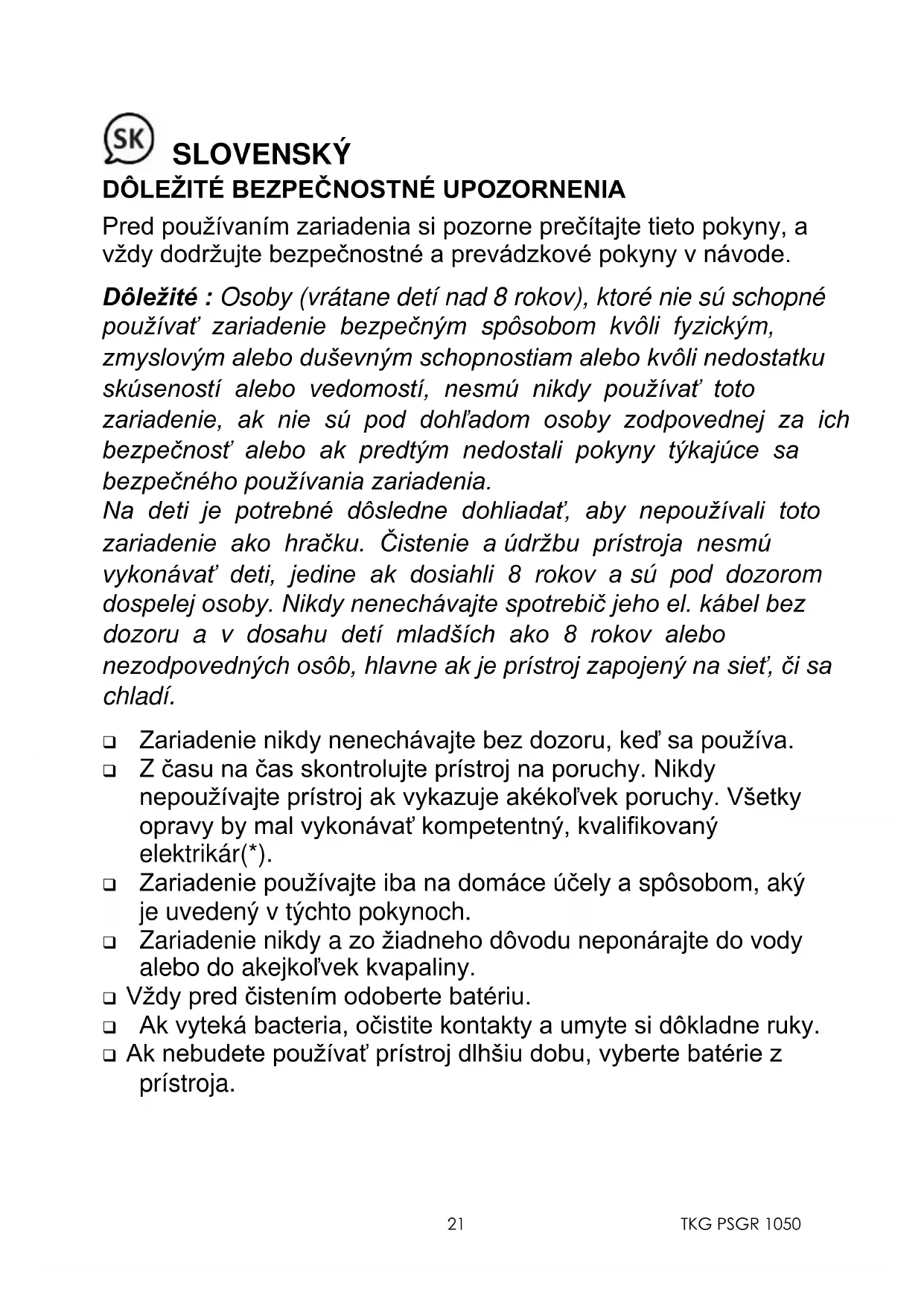 Pred používaním zariadenia si pozorne prečítajte tieto pokyny, a vždy dodržujte bezpečnostné a prevádzkové pokyny v návode. Dôležité : Osoby (vrátane detí nad 8 rokov), ktoré nie sú schopné používať zariadenie bezpečným spôsobom kvôli fyzickým, zmyslovým alebo duševným schopnostiam alebo kvôli nedostatku skúseností alebo vedomostí, nesmú nikdy používať toto zariadenie, ak nie sú pod dohľadom osoby zodpovednej za ich bezpečnosť alebo ak predtým nedostali pokyny týkajúce sa bezpečného používania zariadenia. Na deti je potrebné dôsledne dohliadať, aby nepoužívali toto zariadenie ako hračku. Čistenie a údržbu prístroja nesmú vykonávať deti, jedine ak dosiahli 8 rokov a sú pod dozorom dospelej osoby. Nikdy nenechávajte spotrebič jeho el. kábel bez dozoru a v dosahu detí mladších ako 8 rokov alebo nezodpovedných osôb, hlavne ak je prístroj zapojený na sieť, či sa chladí. ❑ Zariadenie nikdy nenechávajte bez dozoru, keď sa používa. ❑ Z času na čas skontrolujte prístroj na poruchy. Nikdy nepoužívajte prístroj ak vykazuje akékoľvek poruchy. Všetky opravy by mal vykonávať kompetentný, kvalifikovaný elektrikár(*). ❑ Zariadenie používajte iba na domáce účely a spôsobom, aký je uvedený v týchto pokynoch. ❑ Zariadenie nikdy a zo žiadneho dôvodu neponárajte do vody alebo do akejkoľvek kvapaliny. ❑ Vždy pred čistením odoberte batériu. ❑ Ak vyteká bacteria, očistite kontakty a umyte si dôkladne ruky. ❑ Ak nebudete používať prístroj dlhšiu dobu, vyberte batérie z prístroja.TKG PSGR 1050