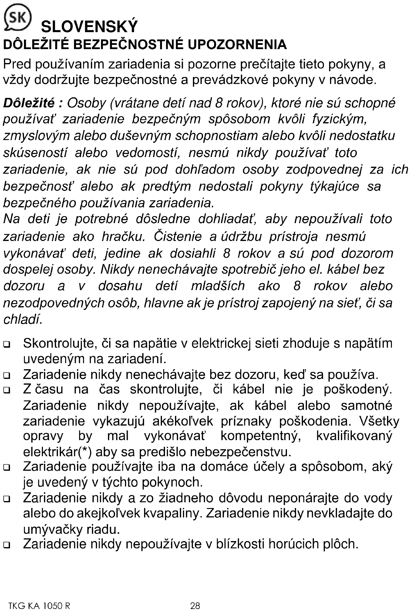❑ Zariadenie vždy pred čistením alebo uskladnením odpojte od elektrického napájania a nechajte ho ochladiť. ❑ Zariadenie nikdy nepoužívajte vonku a vždy ho umiestňujte do suchého prostredia. ❑ Nikdy nepoužívajte príslušenstvo, ktoré neodporúča výrobca. Môže predstavovať nebezpečenstvo pre používateľa a riziko poškodenia spotrebiča. ❑ Zariadenie nikdy nepremiestňujte ťahaním za kábel. Ubezpečte sa, že kábel sa žiadnym spôsobom nemôže niekde zachytiť. Postavte zariadenie na stôl alebo na rovný povrch. Neomotávajte kábel okolo zariadenia ani ho nezohýbajte. ❑ Prístroj nepoužívajte ak je konvica prasknutá alebo poškodená. Používajte len konvicu, ktorá bola dodaná s prístrojom. Pozor, konvica sa počas prevádzky veľmi ohreje. Chytajte ju za uchopenie. ❑ Nikdy sa nedotýkajte horúcich častí prístroja (pozor, aj platnička je horúca), chytajte sa len plastových častí a uchopenia. ❑ Dávajte pozor na to, aby počas procesu pečenia neprišli teplé časti prístroja do styku s ľahko vznetlivými materiálmi ako závesy, obrusy, atď. ... Nebezpečenstvo ohňa! ❑ Keď odstraňujete vodný kameň, používajte iba prostriedky určené na odvápňovanie. Nikdy nepoužívajte amoniak alebo iné prípravky, ktoré sú zdraviu nebezpečné. ❑ Do filtra dávajte iba mletú kávu. ❑ Nikdy nepoužívajte kávovar bez vody v prístroji. ❑ Nikdy nedávajte konvicu do mikrovlnky, aby ste zohriali kávu. ❑ Dôležité: Pri nesprávnom použití by sa spotrebič mohol poškodiť alebo predstavovať nebezpečenstvo pre používateľa. V takomto prípade sa záruka už neuplatňuje a výrobca nenesie zodpovednosť za prípadné škody. (*) Príslušný kvalifikovaný elektrikár: oddelenie popredajného servisu výrobcu alebo dovozcu alebo akejkoľvek osoby, ktorá je kvalifikovaná, schválená a kompetentná vykonávať tento druh opráv, aby sa predišlo všetkým nebezpečenstvám. V prípade potreby vráťte spotrebič tomuto elektrikárovi.TKG KA 1050 R