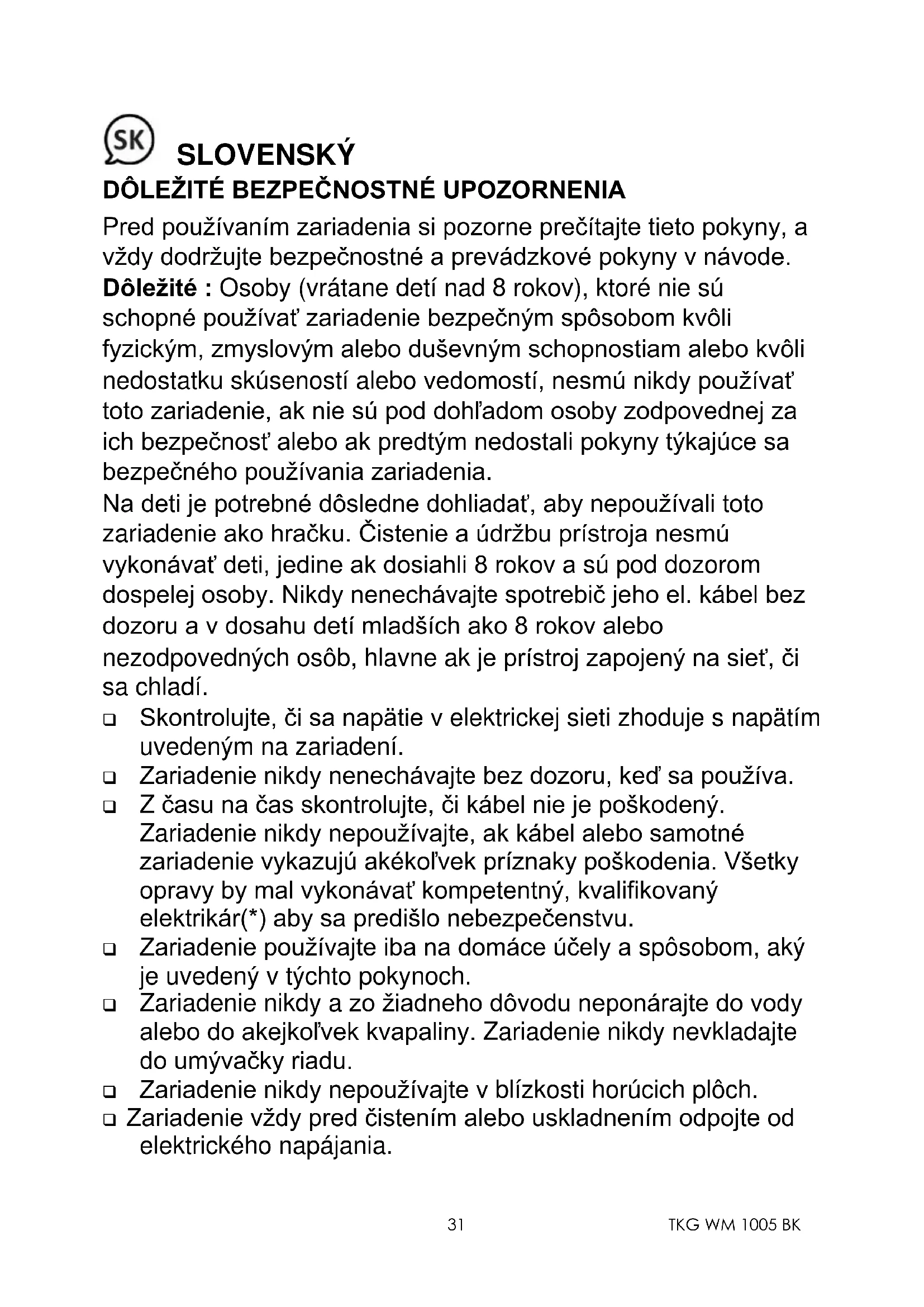 Pred používaním zariadenia si pozorne prečítajte tieto pokyny, a vždy dodržujte bezpečnostné a prevádzkové pokyny v návode. Dôležité : Osoby (vrátane detí nad 8 rokov), ktoré nie sú schopné používať zariadenie bezpečným spôsobom kvôli fyzickým, zmyslovým alebo duševným schopnostiam alebo kvôli nedostatku skúseností alebo vedomostí, nesmú nikdy používať toto zariadenie, ak nie sú pod dohľadom osoby zodpovednej za ich bezpečnosť alebo ak predtým nedostali pokyny týkajúce sa bezpečného používania zariadenia. Na deti je potrebné dôsledne dohliadať, aby nepoužívali toto zariadenie ako hračku. Čistenie a údržbu prístroja nesmú vykonávať deti, jedine ak dosiahli 8 rokov a sú pod dozorom dospelej osoby. Nikdy nenechávajte spotrebič jeho el. kábel bez dozoru a v dosahu detí mladších ako 8 rokov alebo nezodpovedných osôb, hlavne ak je prístroj zapojený na sieť, či sa chladí. ❑ Skontrolujte, či sa napätie v elektrickej sieti zhoduje s napätím uvedeným na zariadení. ❑ Zariadenie nikdy nenechávajte bez dozoru, keď sa používa. ❑ Z času na čas skontrolujte, či kábel nie je poškodený. Zariadenie nikdy nepoužívajte, ak kábel alebo samotné zariadenie vykazujú akékoľvek príznaky poškodenia. Všetky opravy by mal vykonávať kompetentný, kvalifikovaný elektrikár(*) aby sa predišlo nebezpečenstvu. ❑ Zariadenie používajte iba na domáce účely a spôsobom, aký je uvedený v týchto pokynoch. ❑ Zariadenie nikdy a zo žiadneho dôvodu neponárajte do vody alebo do akejkoľvek kvapaliny. Zariadenie nikdy nevkladajte do umývačky riadu. ❑ Zariadenie nikdy nepoužívajte v blízkosti horúcich plôch. ❑ Zariadenie vždy pred čistením alebo uskladnením odpojte od elektrického napájania.TKG WM 1005 BK