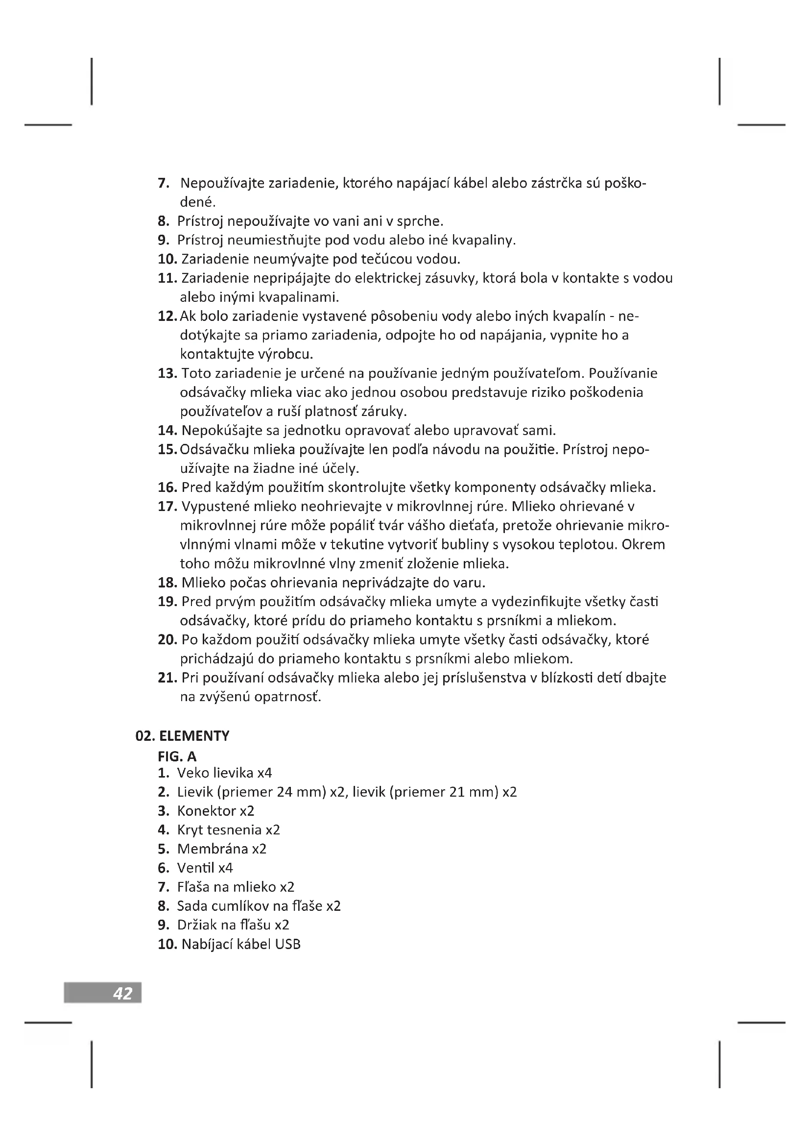 Umývanie a dezinfekcia sú dve rôzne operácie. Musia sa vykonávať oddelene, aby sa chránilo vaše dieťa a zabezpečila sa správna funkcia odsávačky mlieka. Umývanie - umývanie povrchu jednotky a odstraňovanie nečistôt. Dezinfekcia - ničenie organizmov, ako sú baktérie alebo vírusy, ktoré sa môžu nachádzať na povrchu zariadenia.44 Lievik a veko lievika, čas odsávačky mlieka (kĺb, tesnenie, kryt tesnenia), aša a cumlík: Pred prvým použim ho umyte a vydezinkujte. Po každom použi ho umyte. Dezinfekcia raz denne. POZNÁMKA: - Všetky čas stroja, ktoré prichádzajú do kontaktu s mliekom, ihneď po použi stroja oddeľte a umyte. Tým sa odstránia všetky zvyšky mlieka a zabráni sa rastu baktérií. - Na umývanie používajte len pitnú vodu z vodovodu. Ak voda vo vašom vodovode nespĺňa túto požiadavku, používajte balenú vodu. - Pri čistení venlov nepoužívajte kefy. Dávajte pozor, aby ste venl pri čistení neprepichli. - Rozmontujte, umyte a opláchnite všetky čas odsávačky mlieka, ktoré prichádzajú do kontaktu s mliekom, okrem odsávacieho zariadenia. - Pri umývaní čas odsávačky mlieka používajte jemný prostriedok na umývanie riadu alebo mydlo. FIG. D