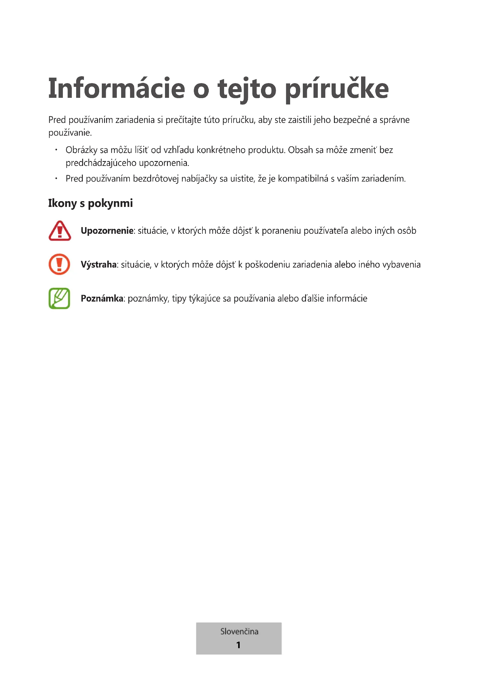 Pred používaním bezdrôtovej nabíjačky sa uistite, že je kompatibilná s vaším zariadením. Ikony s pokynmi Upozornenie: situácie, v ktorých môže dôjsť k poraneniu používateľa alebo iných osôb Výstraha: situácie, v ktorých môže dôjsť k poškodeniu zariadenia alebo iného vybavenia Poznámka: poznámky, tipy týkajúce sa používania alebo ďalšie informácie Slovenčina