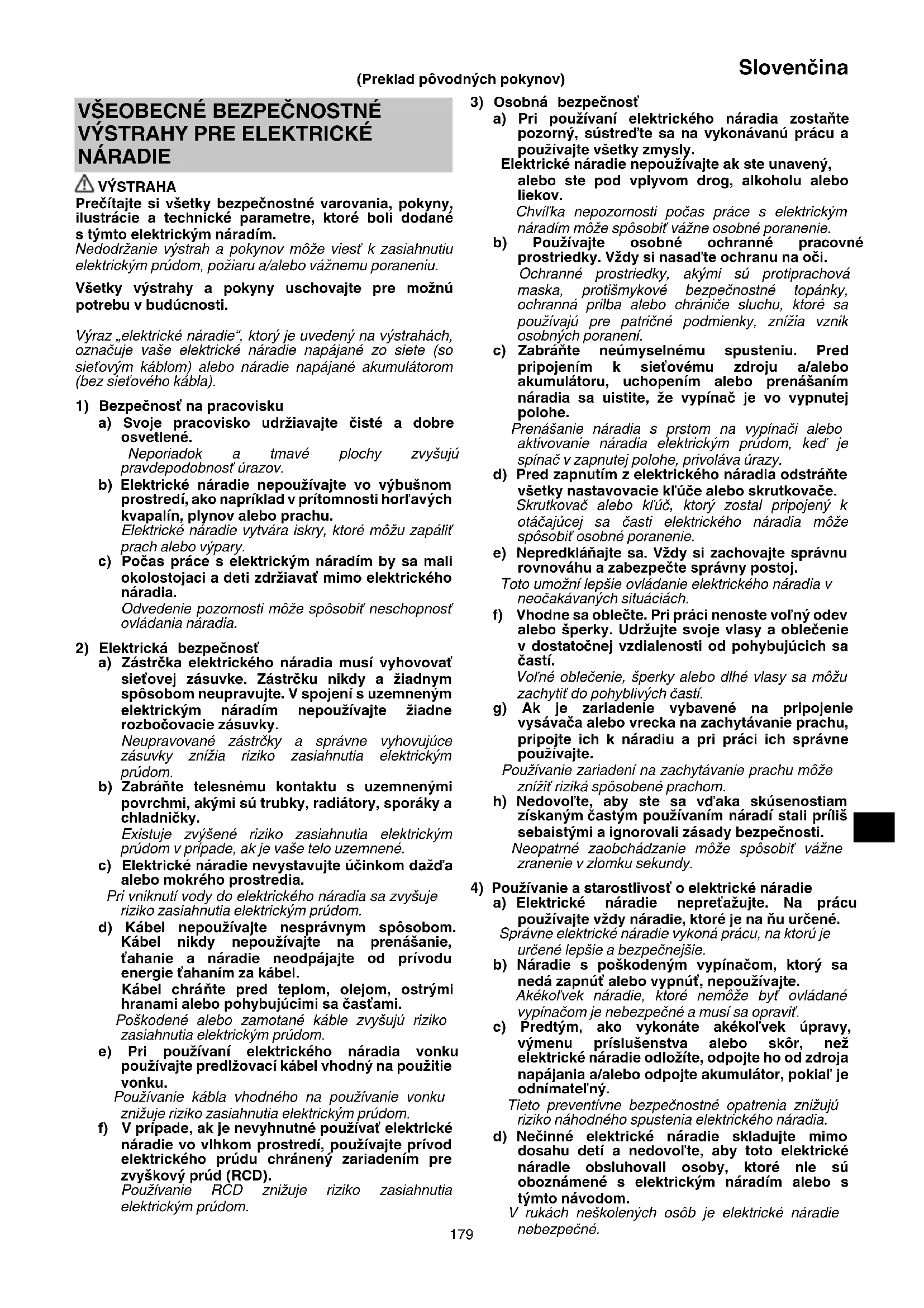 NÁRADIE VÝSTRAHA Prečítajte si všetky bezpečnostné varovania, pokyny, ilustrácie a technické parametre, ktoré boli dodané s týmto elektrickým náradím. Nedodržanie výstrah a pokynov môže viesť k zasiahnutiu elektrickým prúdom, požiaru a/alebo vážnemu poraneniu. Všetky výstrahy a pokyny uschovajte pre možnú potrebu v budúcnosti. Výraz „elektrické náradie“, ktorý je uvedený na výstrahách, označuje vaše elektrické náradie napájané zo siete (so sieťovým káblom) alebo náradie napájané akumulátorom (bez sieťového kábla).