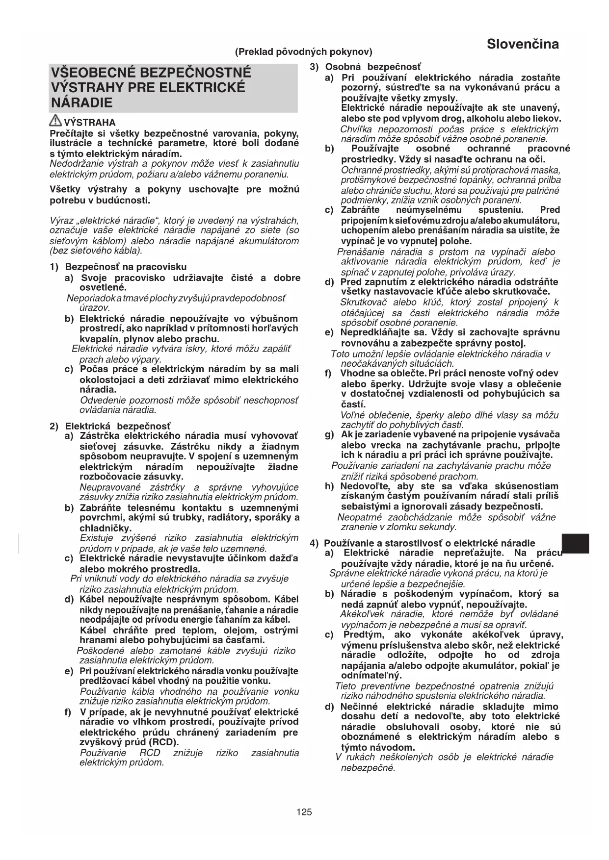 NÁRADIE VÝSTRAHA Prečítajte si všetky bezpečnostné varovania, pokyny, ilustrácie a technické parametre, ktoré boli dodané s týmto elektrickým náradím. Nedodržanie výstrah a pokynov môže viesť k zasiahnutiu elektrickým prúdom, požiaru a/alebo vážnemu poraneniu. Všetky výstrahy a pokyny uschovajte pre možnú potrebu v budúcnosti. Výraz „elektrické náradie“, ktorý je uvedený na výstrahách, označuje vaše elektrické náradie napájané zo siete (so sieťovým káblom) alebo náradie napájané akumulátorom (bez sieťového kábla).