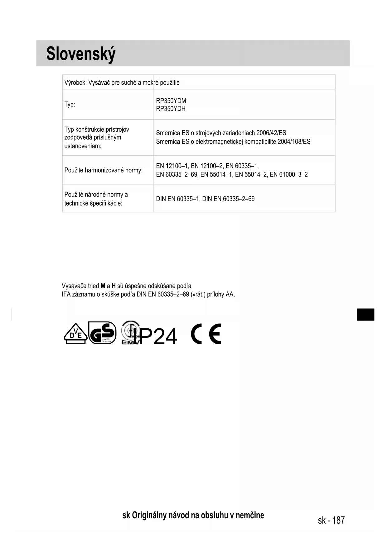 sk Originálny návod na obsluhu v nemčine Výrobok: Vysávač pre suché a mokré použitie Typ: RP350YDMRP350YDHTyp konštrukcie prístrojov zodpovedá príslušným ustanoveniam:Smernica ES o strojových zariadeniach 2006/42/ESSmernica ES o elektromagnetickej kompatibilite 2004/108/ESPoužité harmonizované normy:EN 12100–1, EN 12100–2, EN 60335–1, EN 60335–2–69, EN 55014–1, EN 55014–2, EN 61000–3–2Použité národné normy a technické špecifi kácie:DIN EN 60335–1, DIN EN 60335–2–69 Vysávače tried M a H sú úspešne odskúšané podľa IFA záznamu o skúške podľa DIN EN 60335–2–69 (vrát.) prílohy AA, Ls IP24 0 Slovenský 000BookRP350YDM.indb187000BookRP350YDM.indb187 2019/10/267:31:312019/10/267:31:31188 - sk l NEBEZPEČENSTVO! ▶Nebezpečenstvo udusenia ● Obalový materiál, ako fóliové vrecká, nepatria do detských rúk. ▶Nikdy nestúpajte ani nesadajte na vysávač. ▶Zvláštna pozornosť je potrebná pri vysávaní schodov. Dávajte pozor na bezpečné postavenie. ▶Pripojovacie vedenie a saciu trubicu neťahajte cez ostré hrany, neprelamujte ich ani nezvierajte. ▶Pripojovacie vedenie a saciu trubicu položte vždy tak, aby sa nikto nemohol na nich potknúť. ▶Pri vychádzaní peny alebo kvapaliny vysávač ihneď vypnite. ▶Vnútro krytu udržiavajte vždy suché. ▶Vysávač vrátane príslušenstva neuvádzajte do prevádzky, keď: ● vysávač vykazuje rozpoznateľné škody (trhliny/prasknutia), ● je sieťové pripojovacie vedenie chybné alebo vykazuje tvorenie trhlín, resp. starnutie, ● existujte podozrenie na neviditeľnú chybu (po páde). ▶Nedovoľte, aby sa rotujúce elektrické kefy dostali do kontaktu so sieťovým pripojovacím vedením. l NEBEZPEČENSTVO! ▶Vysávač sa nesmie prevádzkovať vo výbuchom ohrozených oblastiach. ▶Vysávač držte mimo dosahu horľavých plynov a substancií. l NEBEZPEČENSTVO! ▶Nesmú sa vysávať žiadne horľavé alebo výbuchom ohrozené roztoky, materiál nasiaknutý roztokom, prach s nebezpečenstvom výbuchu, kvapaliny ako benzín, olej, alkohol, riedidlo alebo materiál, ktorý je horúcejší ako 60 °C. ▷Inak existuje nebezpečenstvo výbuchu a požiaru! l NEBEZPEČENSTVO! ▶Opravy nechajte vykonávať iba odborníkom, napr. zákazníckemu servisu. Používajte iba originálne náhradné diely. ▶Neodborne opravované prístroje predstavujú nebezpečenstvo pre používateľa. 000BookRP350YDM.indb188000BookRP350YDM.indb188 2019/10/267:31:322019/10/267:31:32sk - 189
