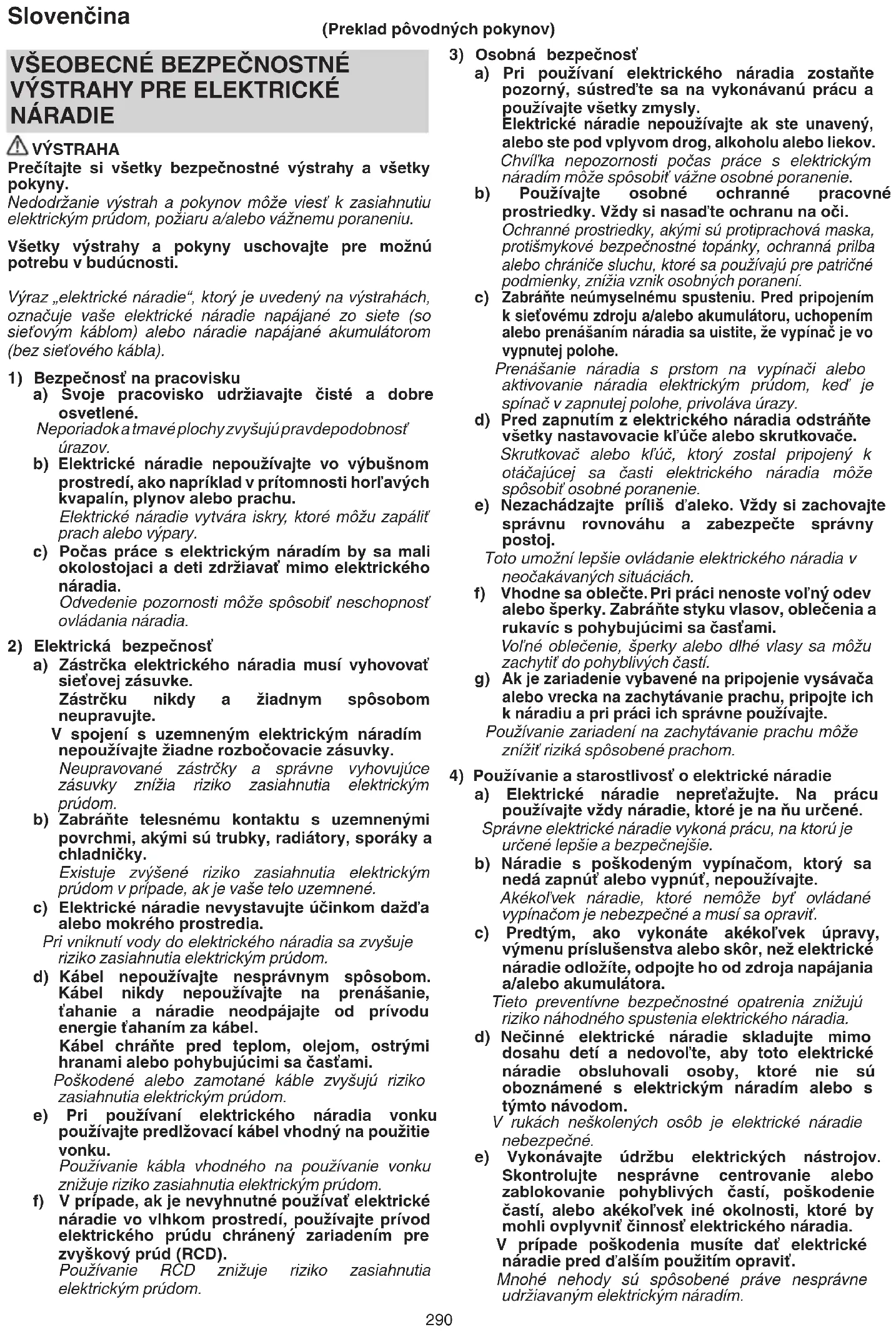 NÁRADIE VÝSTRAHA Prečítajte si všetky bezpečnostné výstrahy a všetky pokyny. Nedodržanie výstrah a pokynov môže viesť k zasiahnutiu elektrickým prúdom, požiaru a/alebo vážnemu poraneniu. Všetky výstrahy a pokyny uschovajte pre možnú potrebu v budúcnosti. Výraz „elektrické náradie“, ktorý je uvedený na výstrahách, označuje vaše elektrické náradie napájané zo siete (so sieťovým káblom) alebo náradie napájané akumulátorom (bez sieťového kábla).