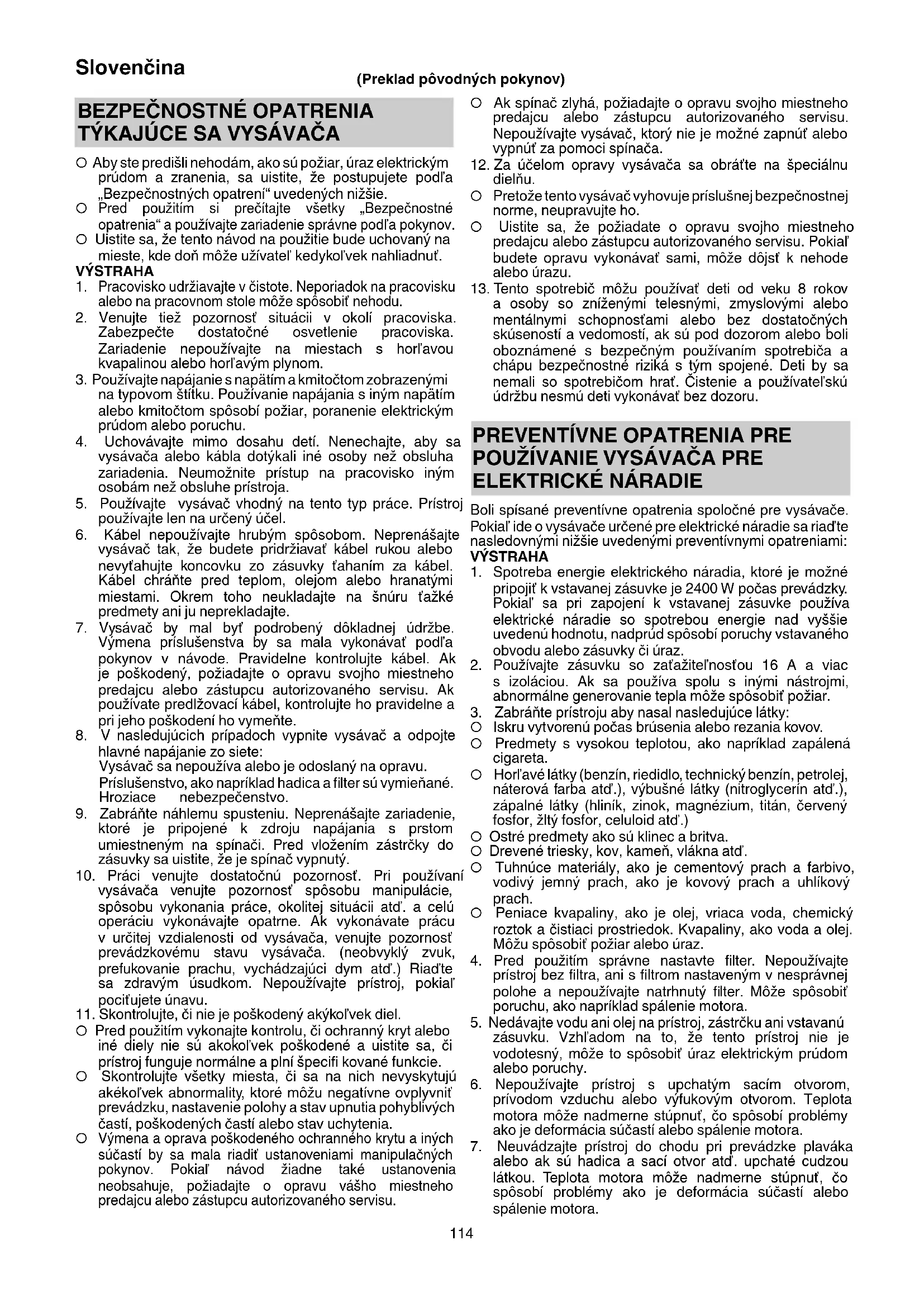 Boli spísané preventívne opatrenia spoločné pre vysávače. Pokiaľ ide o vysávače určené pre elektrické náradie sa riaďte nasledovnými nižšie uvedenými preventívnymi opatreniami: VÝSTRAHA