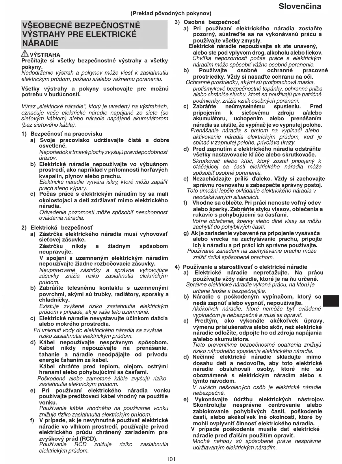 a) Zástrčka elektrického náradia musí vyhovovať sieťovej zásuvke. Zástrčku nikdy a žiadnym spôsobom neupravujte. V spojení s uzemneným elektrickým náradím nepoužívajte žiadne rozbočovacie zásuvky. Neupravované zástrčky a správne vyhovujúce zásuvky znížia riziko zasiahnutia elektrickým prúdom. b) Zabráňte telesnému kontaktu s uzemnenými povrchmi, akými sú trubky, radiátory, sporáky a chladničky. Existuje zvýšené riziko zasiahnutia elektrickým prúdom v prípade, ak je vaše telo uzemnené. c) Elektrické náradie nevystavujte účinkom dažďa alebo mokrého prostredia. Pri vniknutí vody do elektrického náradia sa zvyšuje riziko zasiahnutia elektrickým prúdom. d) Kábel nepoužívajte nesprávnym spôsobom. Kábel nikdy nepoužívajte na prenášanie, ťahanie a náradie neodpájajte od prívodu energie ťahaním za kábel. Kábel chráňte pred teplom, olejom, ostrými hranami alebo pohybujúcimi sa časťami. Poškodené alebo zamotané káble zvyšujú riziko zasiahnutia elektrickým prúdom. e) Pri používaní elektrického náradia vonku používajte predlžovací kábel vhodný na použitie vonku. Používanie kábla vhodného na používanie vonku znižuje riziko zasiahnutia elektrickým prúdom. f) V prípade, ak je nevyhnutné používať elektrické náradie vo vlhkom prostredí, používajte prívod elektrického prúdu chránený zariadením pre zvyškový prúd (RCD). Používanie RCD znižuje riziko zasiahnutia elektrickým prúdom. (Preklad pôvodných pokynov) 0000BookG23SU.indb1010000BookG23SU.indb101 2017/12/0414:13:402017/12/0414:13:40102 Slovenčina f) Rezný nástroj udržiavajte ostrý a čistý. Správne udržiavaný rezný nástroj s ostrými britmi je menej náchylný na zablokovanie a je ľahšie ovládateľný. g) Elektrické náradie, príslušenstvo, brity náradia atď. používajte v súlade s týmito pokynmi a berte do úvahy pracovné podmienky a charakter vykonávanej práce. Používanie elektrického náradia na iné, než určené činnosti môže viesť k vzniku nebezpečných situácií.