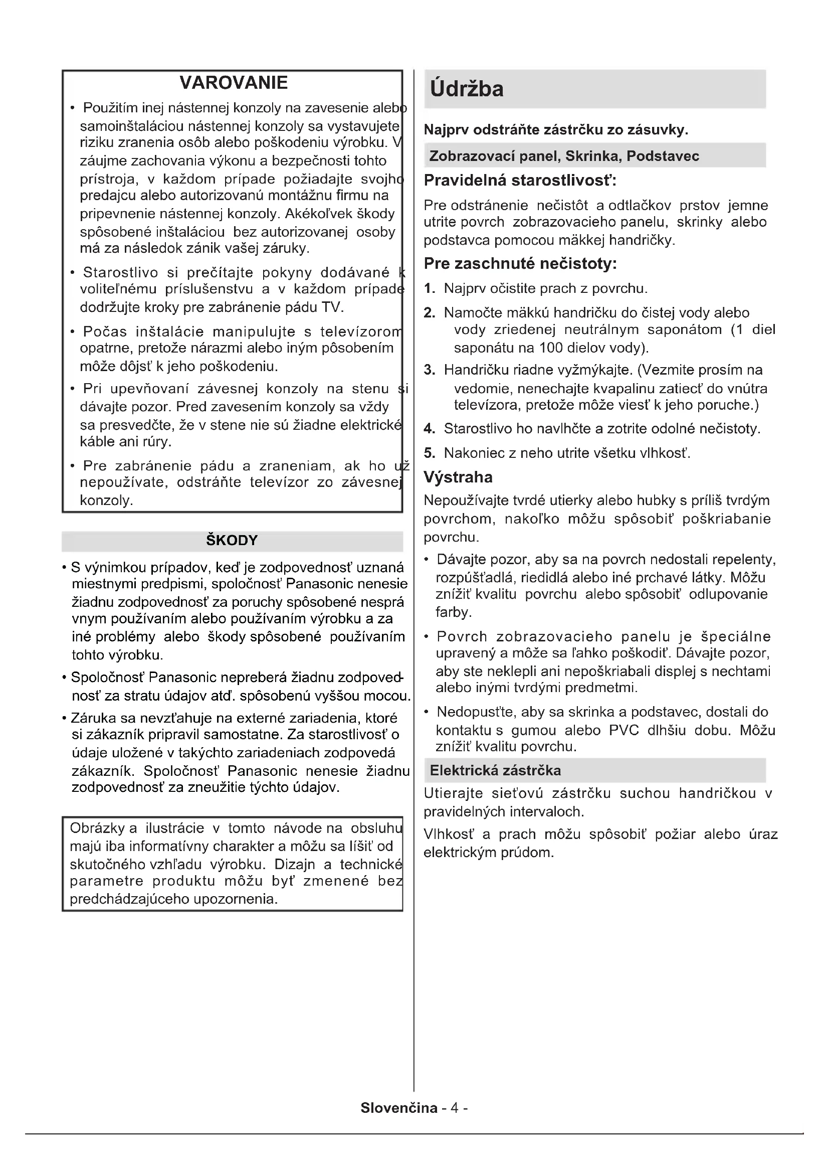 - Záruka sa nevzťahuje na externé zariadenia, ktoré si zákazník pripravil samostatne. Za starostlivosť o údaje uložené v takýchto zariadeniach zodpovedá zákazník. Spoločnosť Panasonic nenesie žiadnu zodpovednosť za zneužitie týchto údajov. Obrázky a ilustrácie v tomto návode na obsluhu majú iba informatívny charakter a môžu sa líšiť od skutočného vzhľadu výrobku. Dizajn a technické parametre produktu môžu byť zmenené bez predchádzajúceho upozornenia. Údržba Najprv odstráňte zástrčku zo zásuvky. Zobrazovací panel, Skrinka, Podstavec Pravidelná starostlivosť: Pre odstránenie nečistôt a odtlačkov prstov jemne utrite povrch zobrazovacieho panelu, skrinky alebo podstavca pomocou mäkkej handričky. Pre zaschnuté nečistoty: