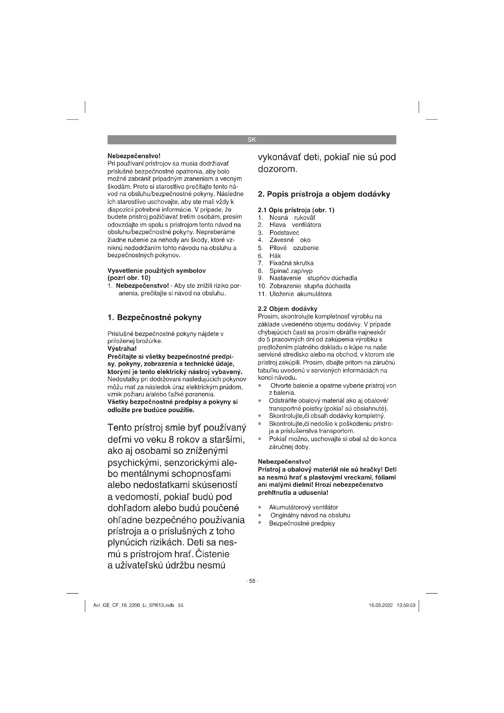 Prístroj sa nachádza v obale za účelom zabráne- nia poškodeniu pri transporte. Tento obal je vyro- bený zo suroviny a tým pádom je ho možné znovu použiť alebo sa môže dať do zberu na recykláciu surovín. Prístroj a jeho príslušenstvo sa skladajú z rôznych materiálov, ako sú napr. kovy a plasty. Poškodené prístroje nepatria do domového odpa- du. Prístroj by sa mal odovzdať k odbornej likvi- dácii na príslušnom zbernom mieste. Pokiaľ Vám nie je známe takéto zberné miesto, informujte sa prosím na miestnej samospráve. Anl_GE_CF_18_2200_Li_SPK13.indb 57Anl_GE_CF_18_2200_Li_SPK13.indb 57 16.03.2022 13:59:5416.03.2022 13:59:54SK