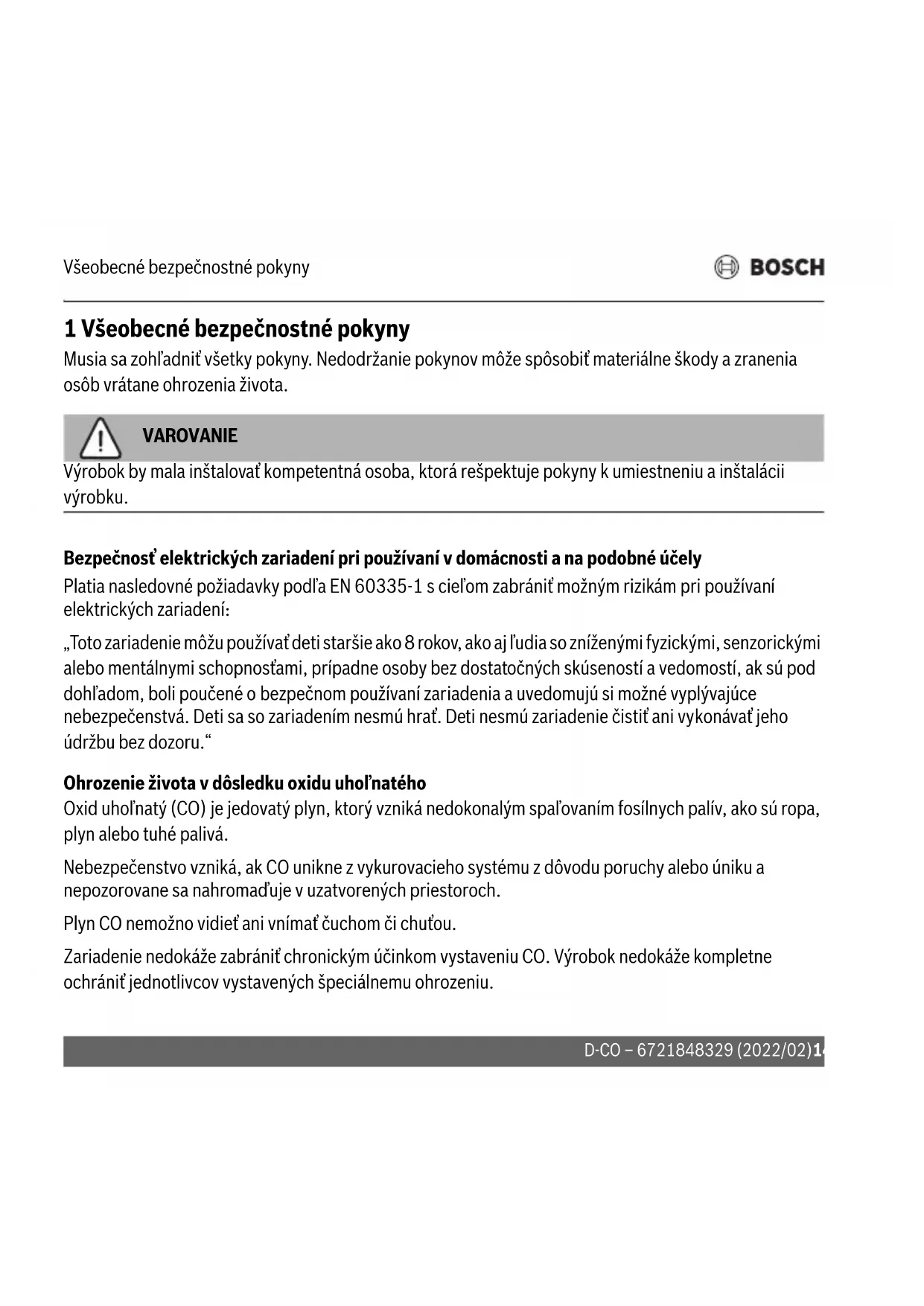 Тип изделия Техническое обслуживание Срок службы элемента питания Осторожно Температура Опасно для жизни xVšeobecné bezpečnostné pokyny D-CO – 6721848329 (2022/02)144 1 Všeobecné bezpečnostné pokyny Musia sa zohľadniť všetky pokyny. Nedodržanie pokynov môže spôsobiť materiálne škody a zranenia osôb vrátane ohrozenia života. VAROVANIE Výrobok by mala inštalovať kompetentná osoba, ktorá rešpektuje pokyny k umiestneniu a inštalácii výrobku. Bezpečnosť elektrických zariadení pri používaní v domácnosti a na podobné účely Platia nasledovné požiadavky podľa EN 60335-1 s cieľom zabrániť možným rizikám pri používaní elektrických zariadení: „Toto zariadenie môžu používať deti staršie ako 8 rokov, ako aj ľudia so zníženými fyzickými, senzorickými alebo mentálnymi schopnosťami, prípadne osoby bez dostatočných skúseností a vedomostí, ak sú pod dohľadom, boli poučené o bezpečnom používaní zariadenia a uvedomujú si možné vyplývajúce nebezpečenstvá. Deti sa so zariadením nesmú hrať. Deti nesmú zariadenie čistiť ani vykonávať jeho údržbu bez dozoru.“ Ohrozenie života v dôsledku oxidu uhoľnatého Oxid uhoľnatý (CO) je jedovatý plyn, ktorý vzniká nedokonalým spaľovaním fosílnych palív, ako sú ropa, plyn alebo tuhé palivá. Nebezpečenstvo vzniká, ak CO unikne z vykurovacieho systému z dôvodu poruchy alebo úniku a nepozorovane sa nahromaďuje v uzatvorených priestoroch. Plyn CO nemožno vidieť ani vnímať čuchom či chuťou. Zariadenie nedokáže zabrániť chronickým účinkom vystaveniu CO. Výrobok nedokáže kompletne ochrániť jednotlivcov vystavených špeciálnemu ohrozeniu.Všeobecné bezpečnostné pokyny 145D-CO – 6721848329 (2022/02) Na vykurovacom systéme nechajte pravidelne vykonávať revíziu a servis špecializovanou firmou. VAROVANIE Inštalovaný alarm by nemal slúžiť ako náhrada správnej inštalácie, správneho používania a správnej údržby zariadení spaľujúcich palivo vrátane vhodnej ventilácie a systémov na odvádzanie spalín. Čo robiť v prípade výskytu alarmu CO ▶ Zachovajte pokoj a otvorte všetky dvere a okná, aby ste zvýšili úroveň ventilácie. ▶ Prestaňte používať zariadenia spaľujúce palivo a ak je to možné, zaistite ich vypnutie. V prípade plynových zariadení zaizolujte núdzový regulačný ventil. ▶ Ak bude alarm aj naďalej pretrvávať, opustite budovu a opäť sa do nej vráťte až potom, keď sa alarm vypne. V budovách s viacerými prevádzkami alebo viacposchodových budovách upozornite na možné riziko všetky prítomné osoby. ▶Komukoľvek, kto trpí účinkami otravy CO, zabezpečte lekársku pomoc a lekárskej službe nahláste podozrenie na inhaláciu CO. ▶ Kontaktujte vhodnú servisnú alebo údržbovú službu. V prípade potreby kontaktujte dodávateľa paliva prostredníctvom tiesňovej linky a národného poskytovateľa plynovej núdzovej služby. Týmto spôsobom možno identifikovať a opraviť zdroj emisií CO. ▶ Zariadenia spaľujúce palivo znova nepoužívajte, kým ich neskontroluje a neschváli kompetentná osoba v súlade s národnými predpismi.Údaje o výrobku D-CO – 6721848329 (2022/02)146 VAROVANIE Ohrozenie života! V prípade, že zvažujete vypnutie alarmu, uvedomte si, že sa alarm aktivoval z dôvodu nebezpečnej úrovne CO, čo znamená, že zotrvanie v okolí zariadenia je nebezpečné. 2Údaje o výrobku