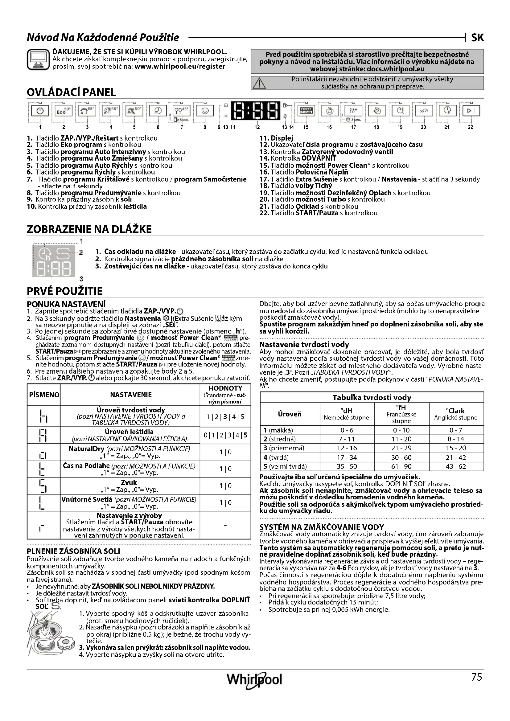 ĎAKUJEME, ŽE STE SI KÚPILI VÝROBOK WHIRLPOOL. Ak chcete získať komplexnejšiu pomoc apodporu, zaregistrujte, prosím, svoj spotrebič na: www.whirlpool.eu/register Pred použitím spotrebiča si starostlivo prečítajte bezpečnostné pokyny anávod na inštaláciu. Viac informácií ovýrobku nájdete na webovej stránke: docs.whirlpool.eu Po inštalácii nezabudnite odstrániť zumývačky všetky súčiastky na ochranu pri preprave. PONUKA NASTAVENÍ