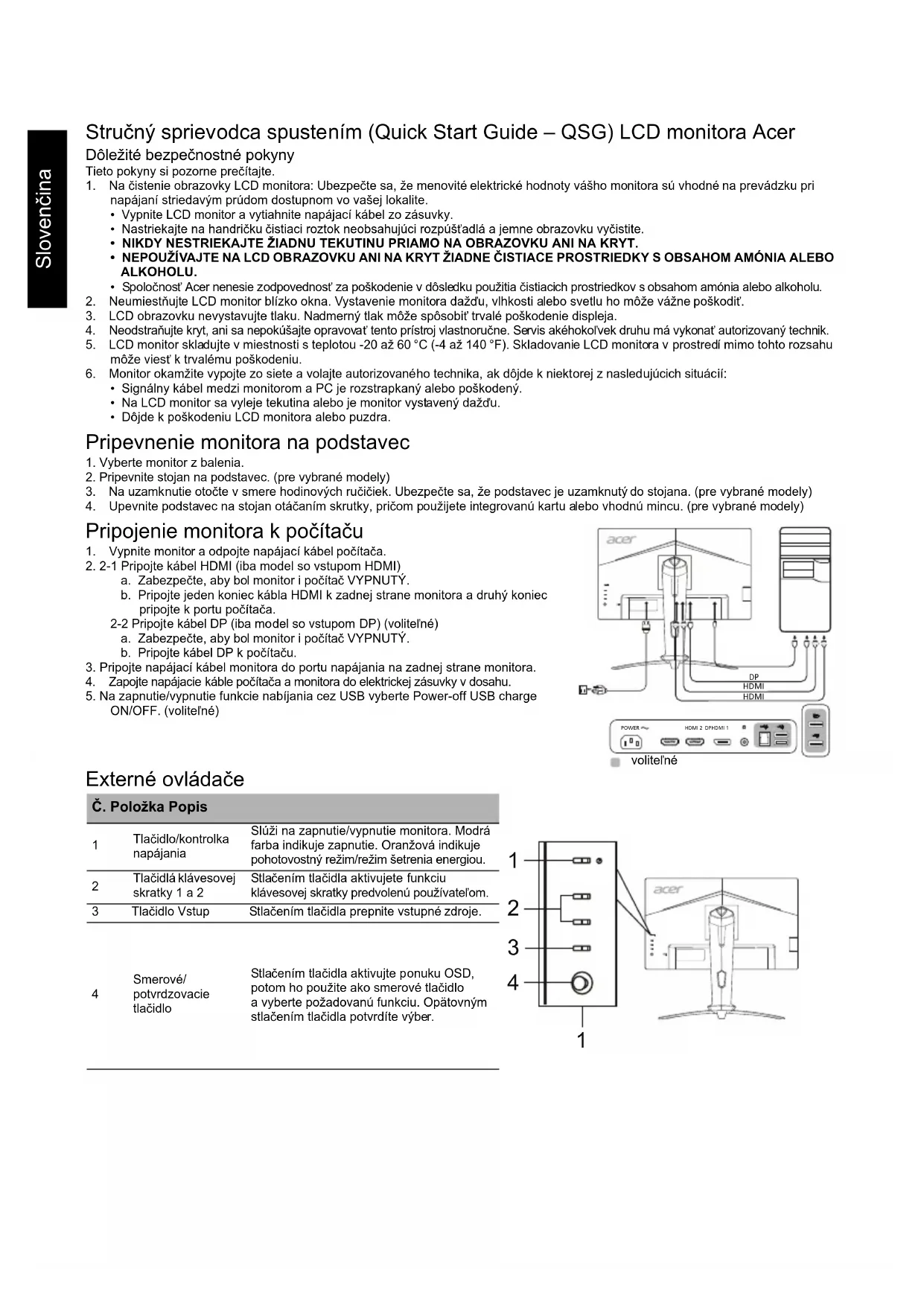 Kontrast 100000000:1 Max (ACM) Pozorovací uhol 178° (H) 178° (V) (CR = 10) Doba odozvy 1 ms (G ku G) / 0,5 ms (G ku G, min.) Typ panela IPS Horizontálna frekvencia HDMI: 31 - 255 kHz DP: 255 - 255 kHz Vertikálna frekvencia HDMI: 56 - 240 Hz DP: 48 - 240 Hz Farby displeja 16,7 milióna Max. obnovovacia frekvencia bodov 600 MHz Maximálne rozlíšenie 1920 x 1080 pri 240 Hz Technológia Plug & Play VESA DDCCI/DDC2B Trieda energetickej účinnosti A *Ročná spotreba energie 31 (kWh) (pre model so vstupom HDMI) Spotreba energie (pri 200 nitov) Režim zapnutia 17,4 W (charakteristicky) Režim spánku 0,45 W (charakteristicky) Režim vypnutia 0,25 W (charakteristicky) Vstupný konektor HDMI (iba model so vstupom HDMI) DP (iba model so vstupom DP) Vstupný signál videa HDMI (iba model so vstupom HDMI) (voliteľné) DP (iba model so vstupom DP) (voliteľné) Reproduktory 2 W x 2 (iba model so vstupom Audio) (voliteľné) USB USB 3.0 x 4 (voliteľné) Maximálna veľkosť obrazovky Horizontálne: 543,744 mm Vertikálne: 302,616 mm Zdroj napájania 100 – 240 V, 50/60 Hz Podmienky prostredia Prevádzková teplota: 0 až 40 °C Teplota skladovania: -20 až 60 °C Prevádzková vlhkosť: 20 % až 80 % Rozmery 557,79 (š) x 397,84 ~ 512,84 (v) x 236,27 (h) mm Hmotnosť (netto) 5,30 kg (netto) Špecifikácie mechanizmu Vyklopenie: -5° až +25° (iba v najvyššom bode možno ponúknuť 25 stupňov zaklopenia pre uhol elevácie) Otáčanie: -20° až +20° Nastavenie výšky: 0 mm až 115 mm Vyklápanie: -90° až +90° Odpojiteľný stojan: Áno Vonkajšie ovládače Prepínač/Tlačidlá Tlačidlo zapnutia Tlačidlo klávesovej skratky 1 Tlačidlo klávesovej skratky 2 Vstup Ponuka/Smerové/Potvrdzovacie Funkcie Jas Kontrast Modré svetlo Zvýraznenie čiernej ACM HDR Zvýšená ostrosť Gama Teplota farieb Režimy Priestor farieb Režim odtieňov sivej 6-osový odtieň 6-osová sýtosť Hlasitosť Stlmiť Pretaktovanie Adaptive-Sync Hodnota obnovovacej frekvencie VRB Ultra nízke oneskorenie Mieridlo Jazyk Časový limit OSD Transparentnosť Zámok OSD Vstup Automatický zdroj Formát DP Priradenie kláv. skratiek Širokouhlé DDC/CI Úroveň čiernej na HDMI Režim rýchleho spustenia Nabíjanie USB pri vypnutí Informácie o displeji Obnoviť všetky nastavenia Ukončiť Všetky špecifikácie môžu podliehať zmenám bez predchádzajúceho oznámenia.Dansk Guide til hurtig opstart af LCD-skærm fra Acer Vigtige sikkerhedsinstruktioner Læs følgende instruktioner grundigt. 1. Sådan rengøres LCD-skærmen: Sørg for, at skærmen er elektrisk klassificeret til at fungere med den tilgængelige vekselstrøm, hvor du befinder dig.• Sluk for LCD-skærmen, og tag netledningen ud.
