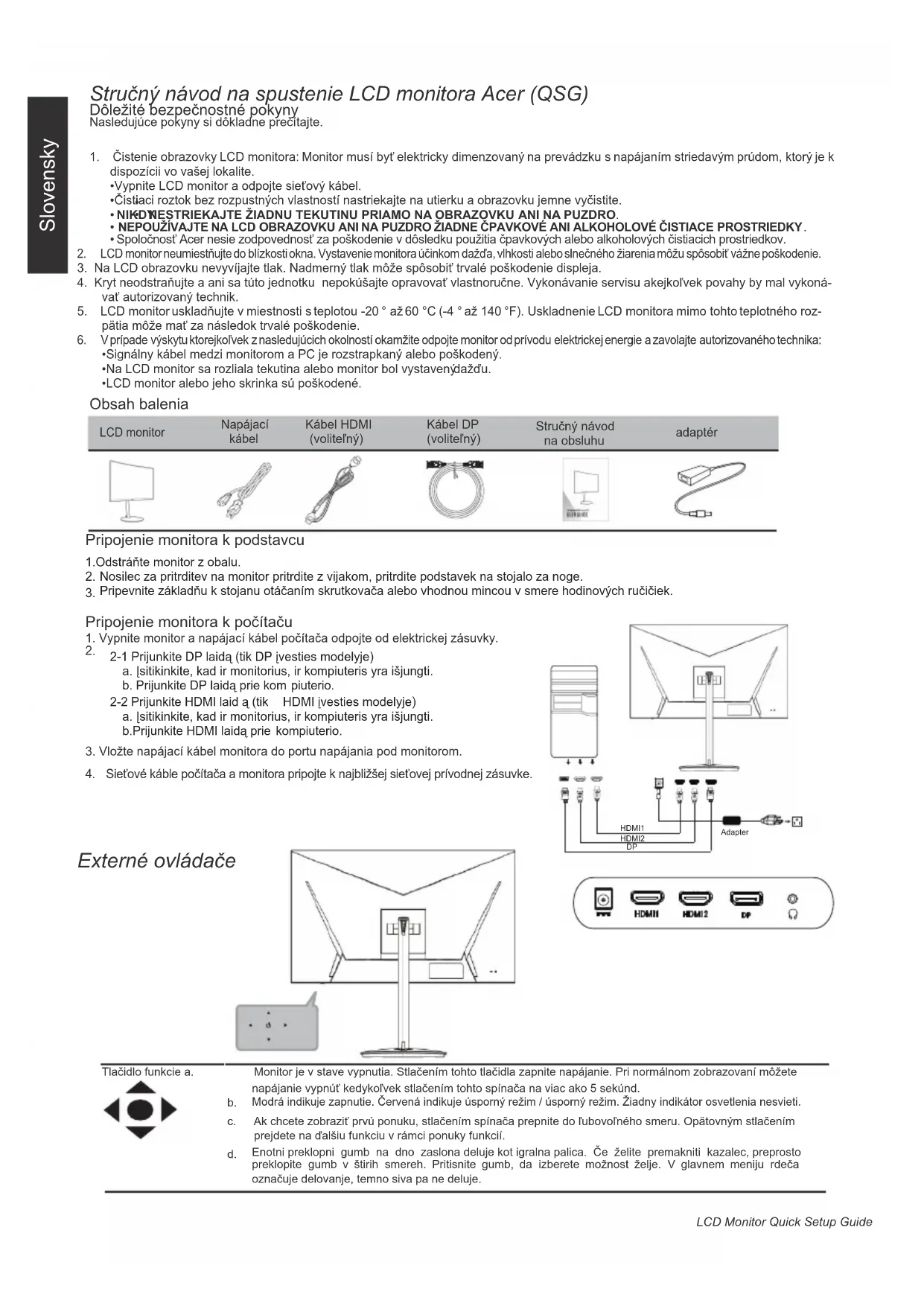 Obsah balenia ([WHUQpRYOiGDþH 6WUXþQêQiYRGQDVSXVWHQLH/&'PRQLWRUDAcer 46* Dôležité bezpečnostné pokyny Nasledujúce pokyny si dôkladne prečítajte. 1. Čistenie obrazovky LCD monitora: Monitor musí byť elektricky dimenzovaný na prevádzku s napájaním striedavým prúdom, ktorý je k dispozícii vo vašej lokalite.•Vypnite LCD monitor a odpojte sieťový kábel.•Čistiaci roztok bez rozpustných vlastností nastriekajte na utierku a obrazovku jemne vyčistite. 2. LCD monitor neumiestňujte do blízkosti okna. Vystavenie monitora účinkom dažďa, vlhkosti alebo slnečného žiarenia môžu spôsobiť vážne poškodenie. 3. Na LCD obrazovku nevyvíjajte tlak. Nadmerný tlak môže spôsobiť trvalé poškodenie displeja.4. Kryt neodstraňujte a ani sa túto jednotku nepokúšajte opravovať vlastnoručne. Vykonávanie servisu akejkoľvek povahy by mal vykoná-vať autorizovaný technik. 5. LCD monitor uskladňujte v miestnosti s teplotou -20 ° až 60 °C (-4 ° až 140 °F). Uskladnenie LCD monitora mimo tohto teplotného roz- pätia môže mať za následok trvalé poškodenie. 6. V prípade výskytu ktorejkoľvek z nasledujúcich okolností okamžite odpojte monitor od prívodu elektrickej energie a zavolajte autorizovaného technika: